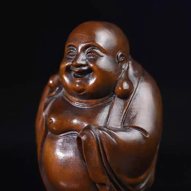 This captivating Buddha statue is skillfully carved from natural boxwood. The artisan craftsmanship highlights the wood's beautiful grain. Admire the artisan's attention to detail, from the smiling face to the prayer beads behind. Cherish the unique character, a testament to its handcrafted origins.