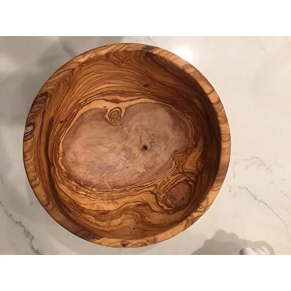 This product is a handcrafted item made from a single piece of solid olive wood, sourced sustainably from mature olive trees in the Southern Mediterranean, typically 200-300 years old. The wood features unique burl grains and natural colors, with no stains used. Each piece is carefully finished with sandpaper and sealed with olive oil, ensuring that each item is one-of-a-kind. Our products are crafted under fair trade agreements, reclaimed, and produced sustainably. Available in various sizes, including small (6 inches in diameter, 2.4 inches high), medium (7 x 2.8 inches), large (8 x 3.2 inches), extra large (11 x 3.5 inches), and XXL (12 x 4 inches), these olivewood bowls are substantial, with a thickness of approximately 0.6 inches. Due to the natural characteristics of the aged olive trees and the hand-carving process, dimensions, shape, and natural imperfections may vary. The photos provided are examples and not the exact item you will receive. These decorative wooden bowls are perfect for serving a variety of foods, such as salads, fruits, snacks, and more. They can also be used as a centerpiece for farmhouse-style décor, for potpourri, or to display keys and jewelry. They add a professional chef's touch to your home or kitchen table presentations, making them ideal for gatherings and parties. Orchard Hardwoods' olive wood bowls and boards are unique and personalized gifts for various occasions, including birthdays, weddings, anniversaries, and holidays. To maintain the quality of the wood, gently hand wash with a soft sponge and warm water, then dry gently. Occasionally wipe with olive oil, mineral oil, or food-grade beeswax to prevent drying. Avoid placing them in the dishwasher, soaking them in water, or exposing them to direct sunlight or heat sources. Orchard Hardwoods products are produced in a small, family-owned factory in Tunisia, where skilled artisans craft these items under fair trade agreements. The old non-bearing olive trees are harvested and reclaimed under government permits, with new trees being replanted in their place, ensuring sustainability.