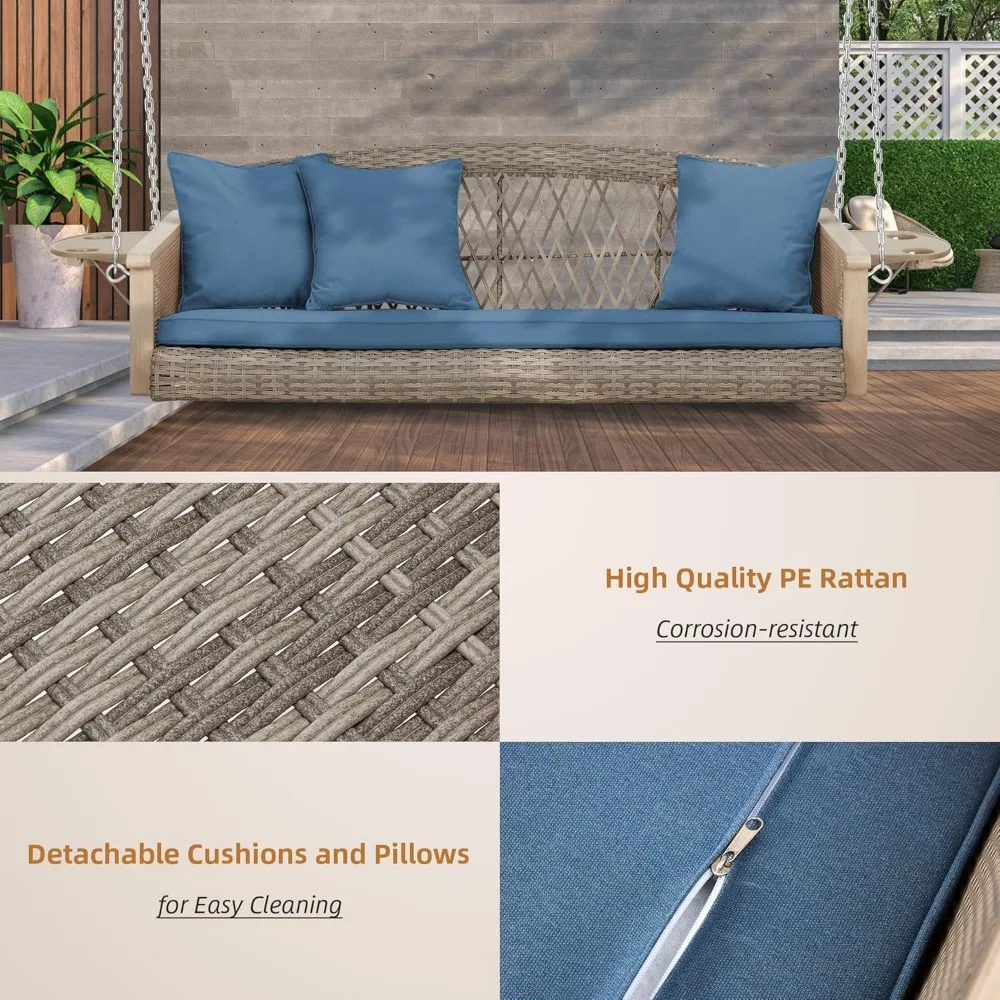 This spacious patio swing offers a generous 55-inch seat, comfortably accommodating up to three individuals. It includes one plush seat cushion and three back pillows for optimal relaxation. The cushion covers are equipped with zippers, allowing for convenient removal and cleaning. Crafted with a rust-resistant steel frame and wrapped in hand-woven PE rattan, this swing is designed to withstand all weather conditions, featuring waterproof and UV-resistant properties. The polyester covers are also water repellent, ensuring the swing's durability for years of outdoor use. The swing has been upgraded with a deeper cup holder, now 1.5 inches deep, providing a more stable resting place for beverages. It comes with two reinforced steel chains, suitable for various settings like balconies, backyards, and gardens, and can support a weight capacity of up to 900lbs. For ceiling mounting, additional long chains and hanging hooks may be required. Assembly is straightforward, with all necessary hardware and clear instructions provided. Friendly customer service is available to address any issues related to shipping damage, defects, missing parts, or other concerns.