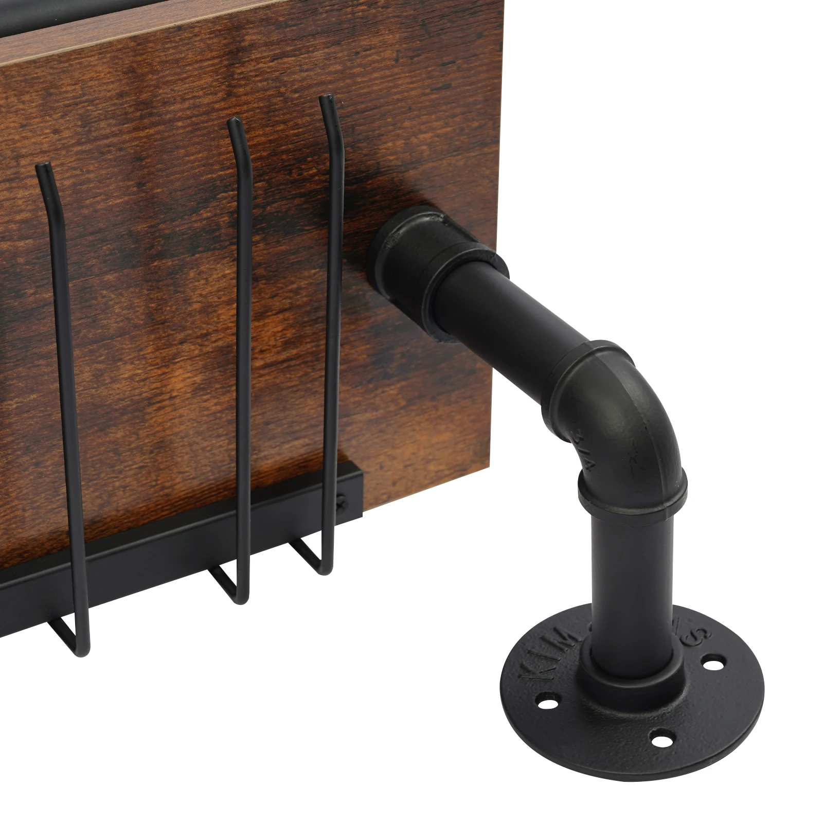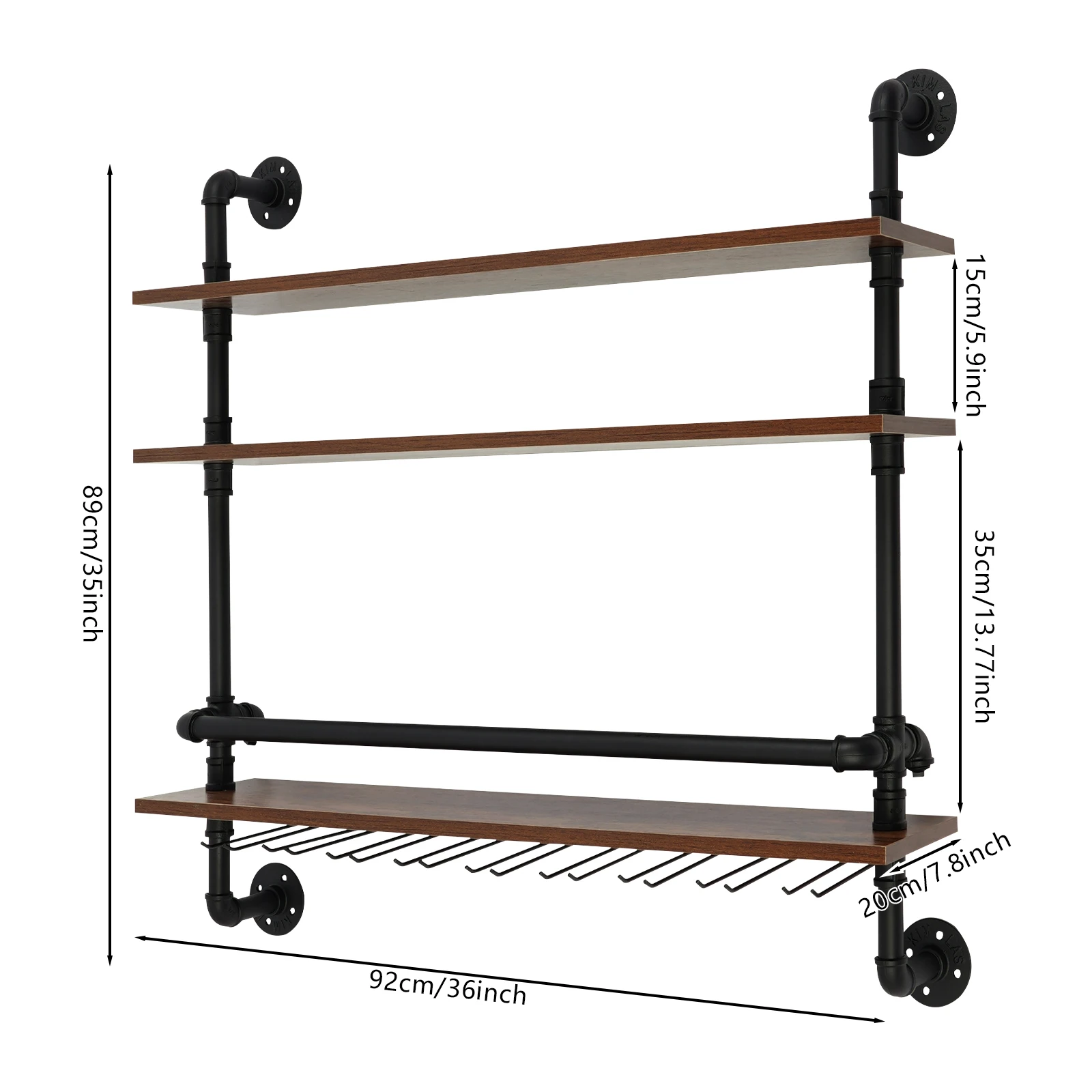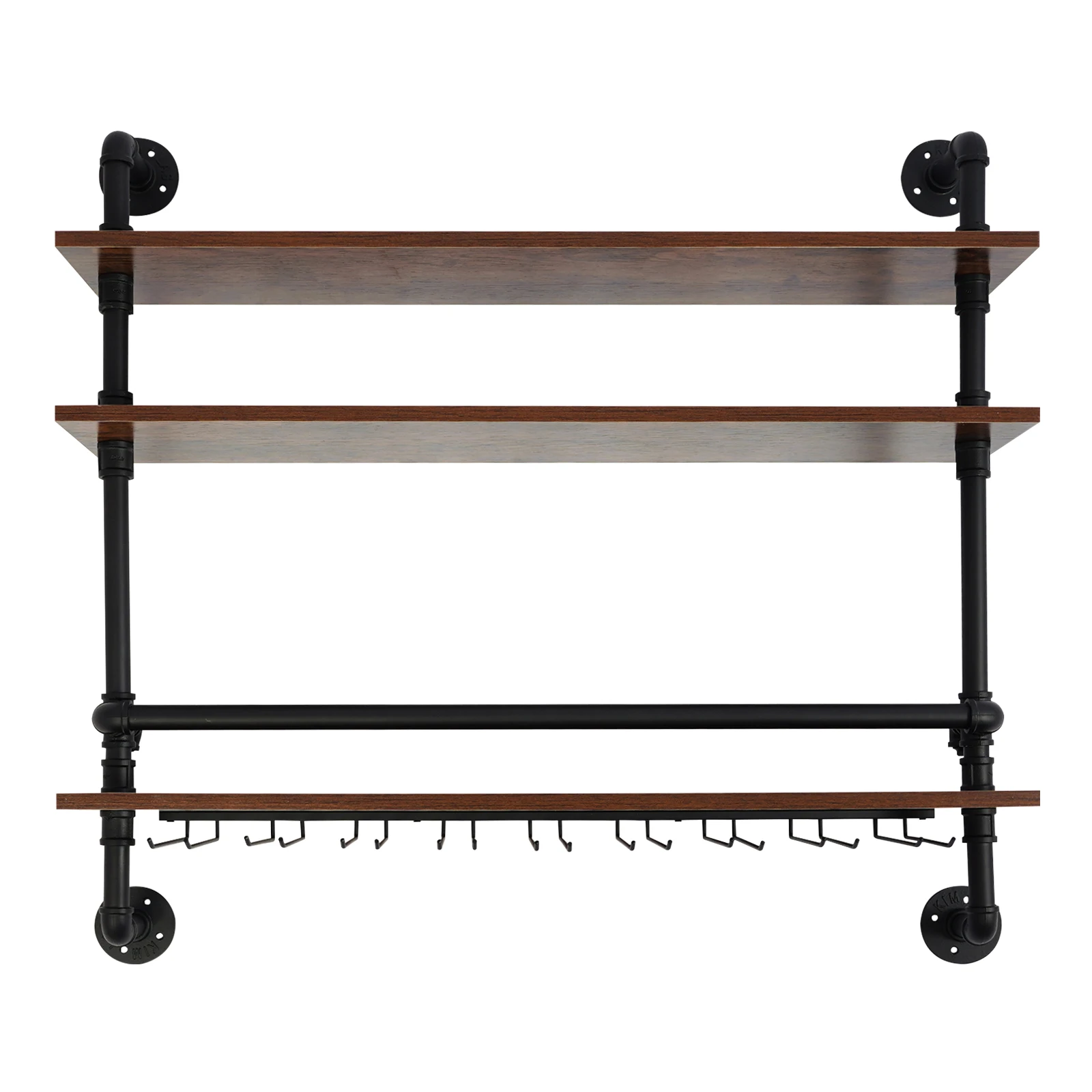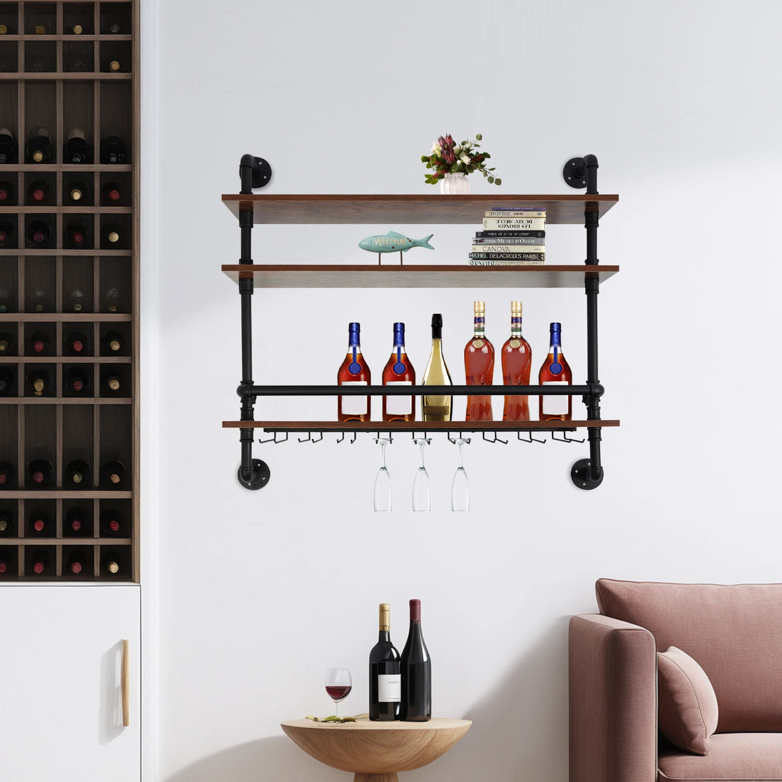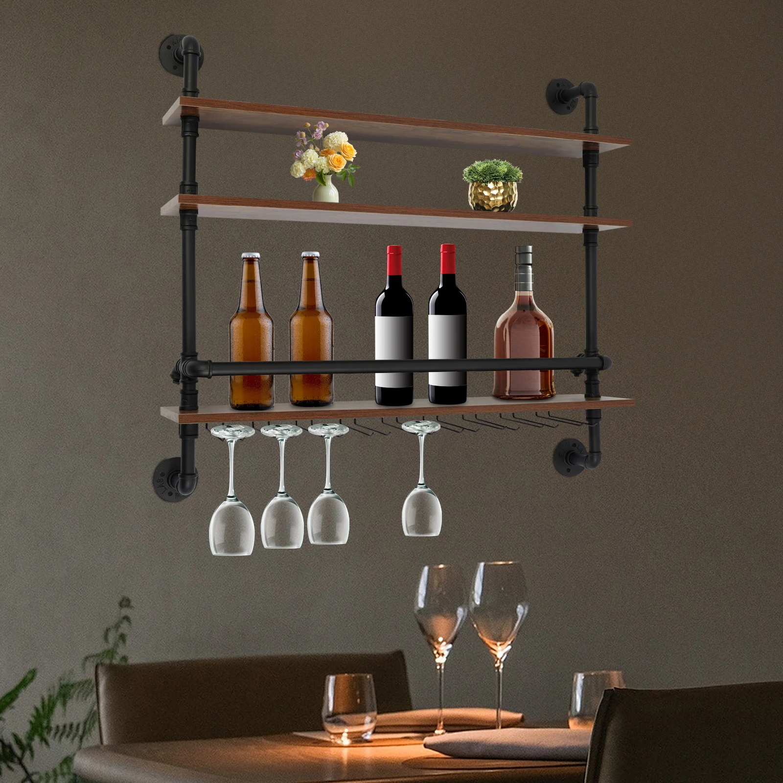 Industrial 3-Tier Wall Mounted Wine Rack with Glass Holders Guard Rails Iron Wood for Wine Bottle...