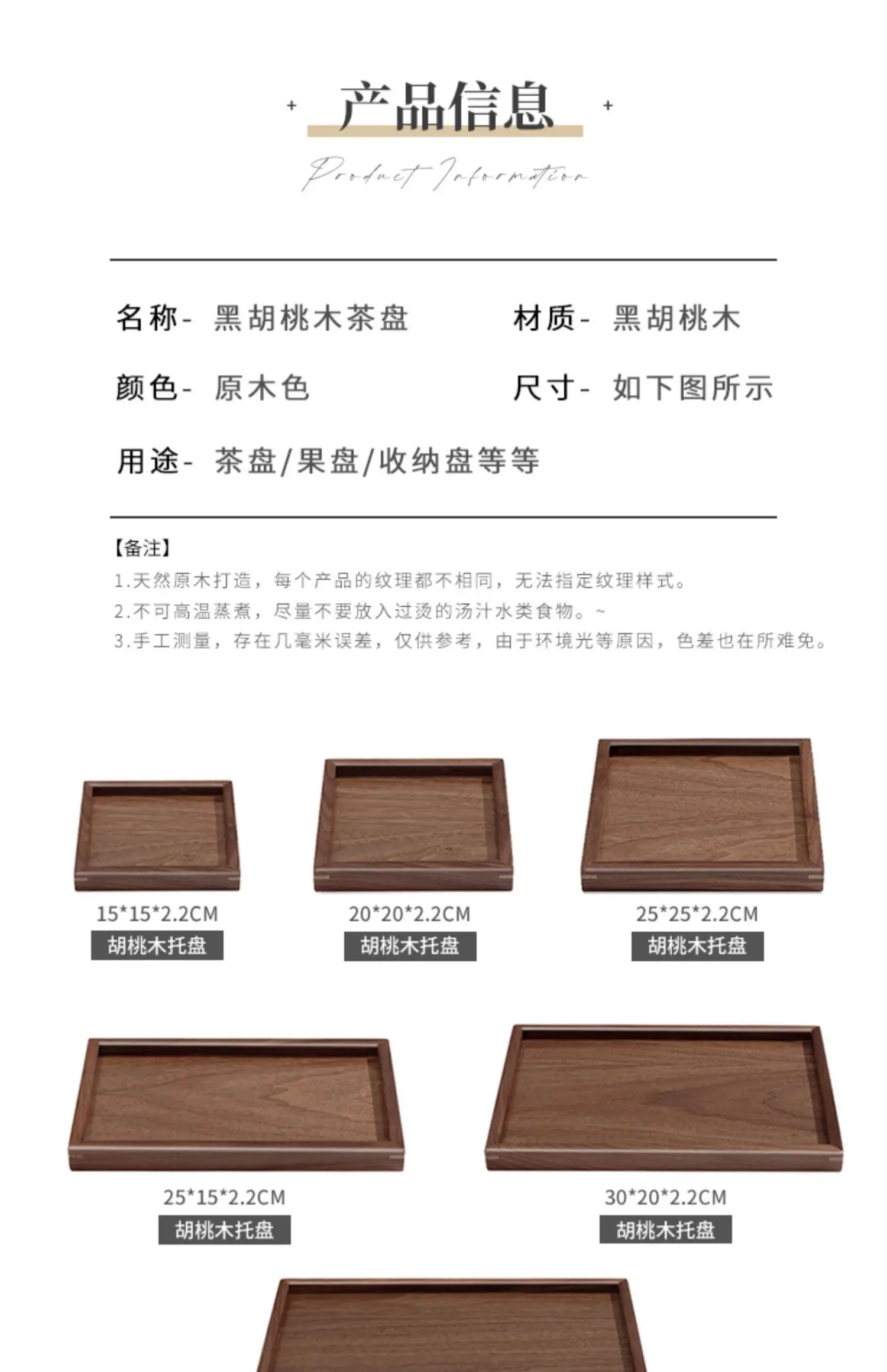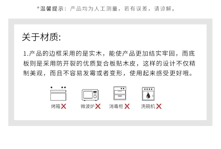 Note: Because the logs grow naturally, there are slight differences in texture and color shades. Notes on the use of wood: 1. Microwave oven is prohibited 2. Prohibited to put in the high temperature or warm roadside 3. Avoid direct sunlight 4. Prohibit the use of bleach cleaning 5. Prohibit the use of wire hard objects to wipe