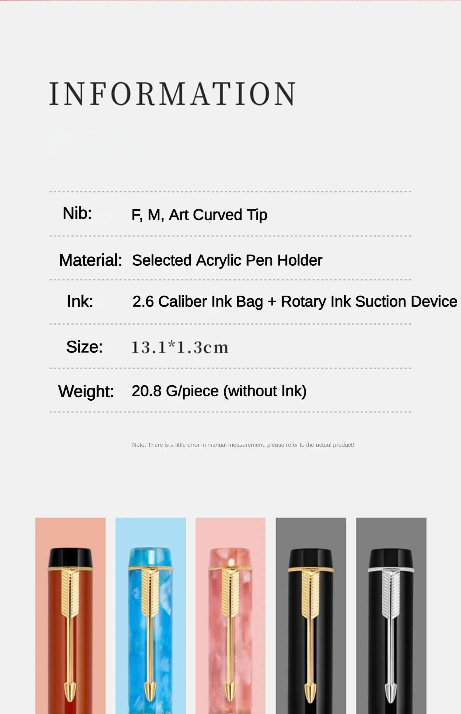 The innovative 2-in-1 ink supply system brings you a more convenient way to change ink. Whether it's a 2.6-caliber ink bag or a rotary ink suction device, it can easily meet your needs. A variety of pen tips, including EF, F, M, and art curved tips, make your writing more personalized and practical.