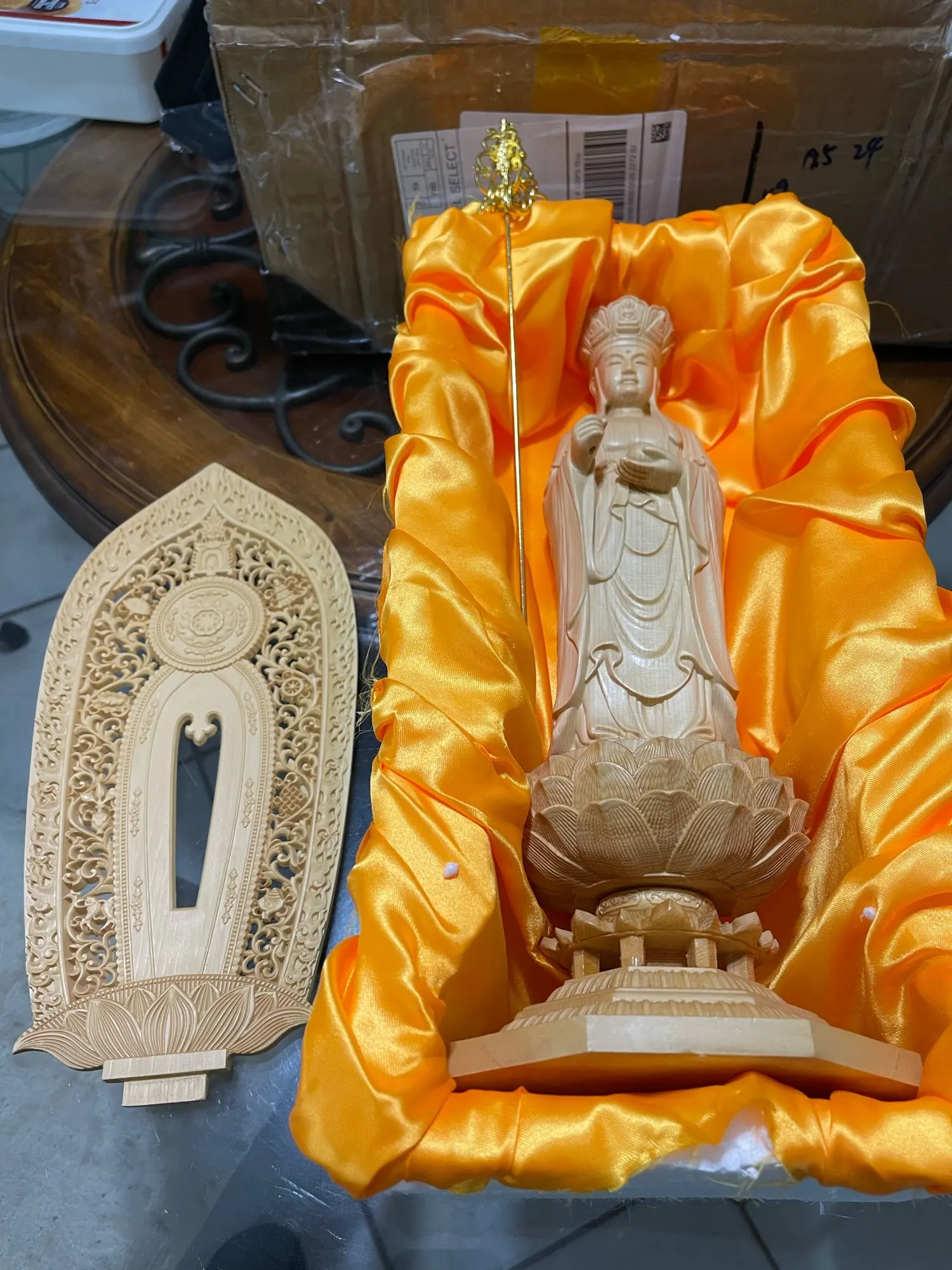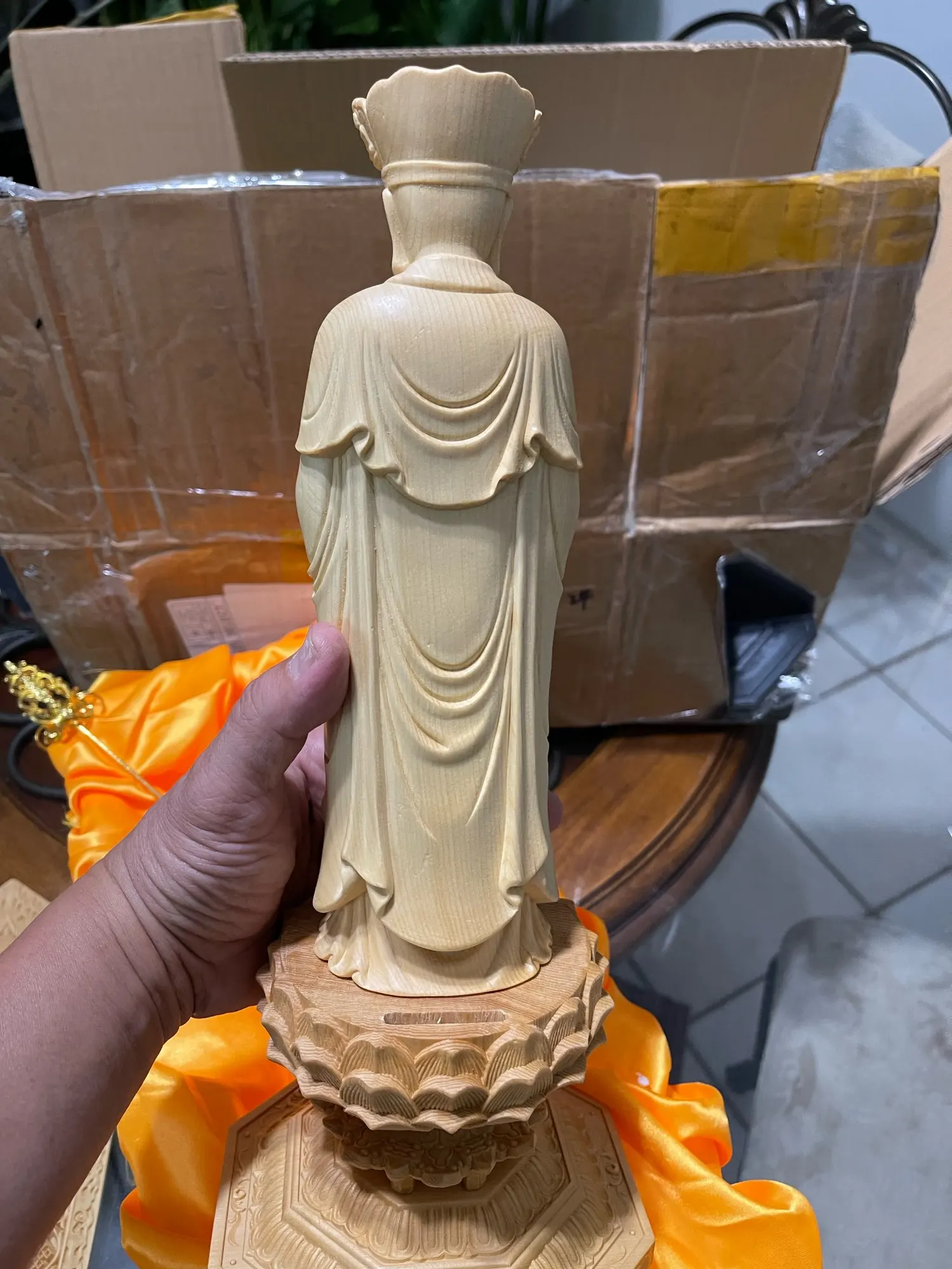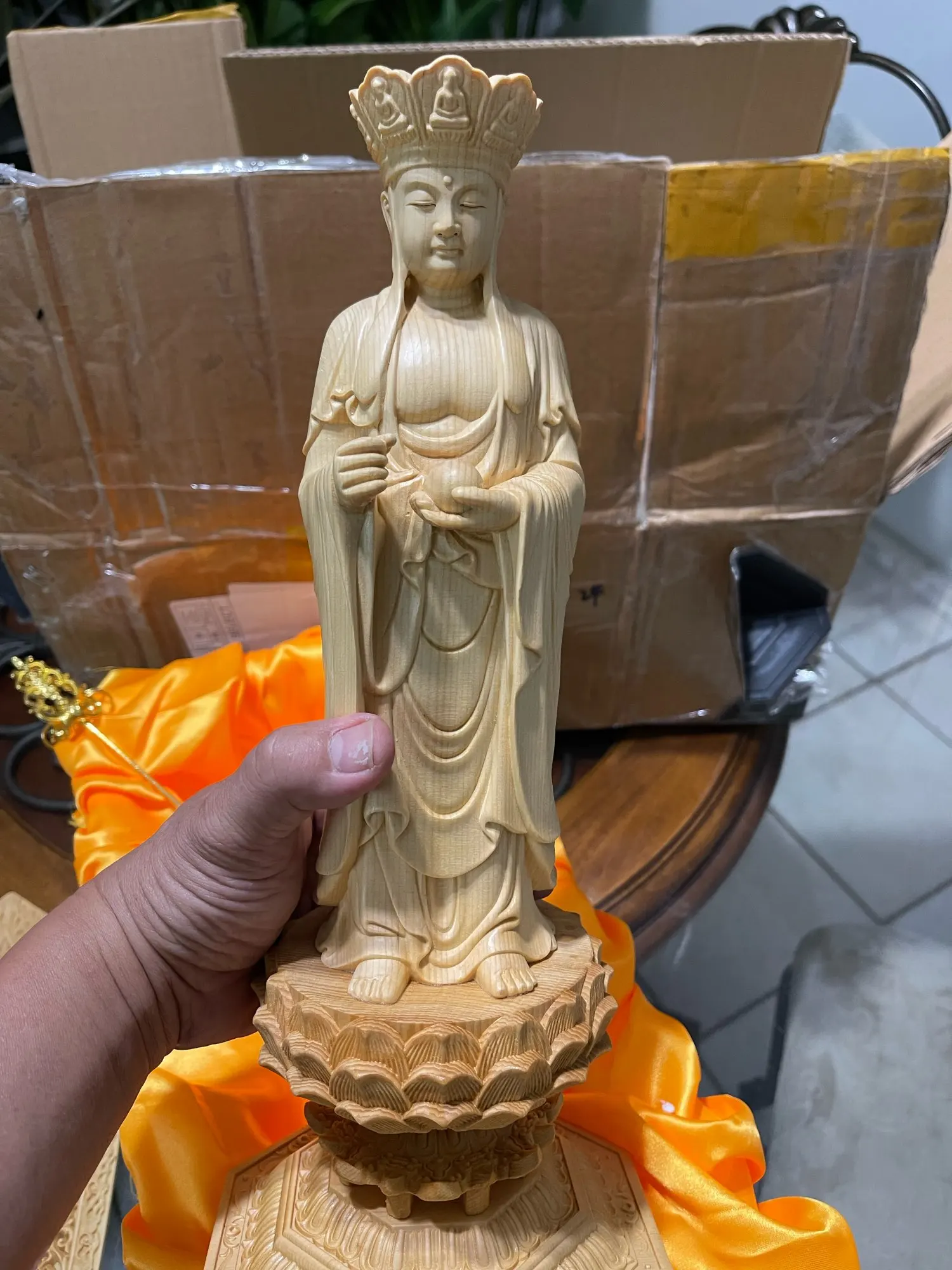 Crafted from solid Kiso Hinoki Cypress wood (Japanese Hinoki), this statue showcases exceptional detail and artistry. Each curve and fold of the flowing robes, the intricate carvings of the crown and halo, all highlight the artisan's mastery of hand-carving techniques. Its natural wood grain adds a unique, one-of-a-kind touch, ensuring no two statues are identical.
