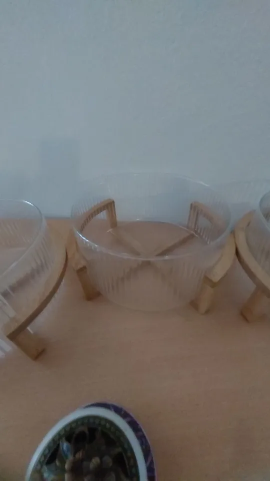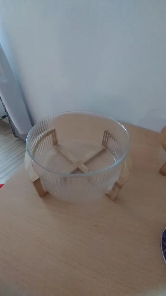 KEMORELA Striped Glass Bowl with Wooden Stand Scratch-Resistant round Salad Fruit Dessert Display for Living Room
