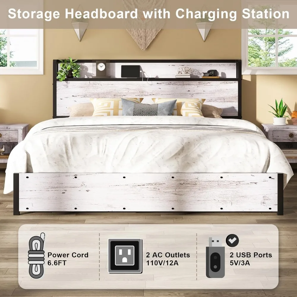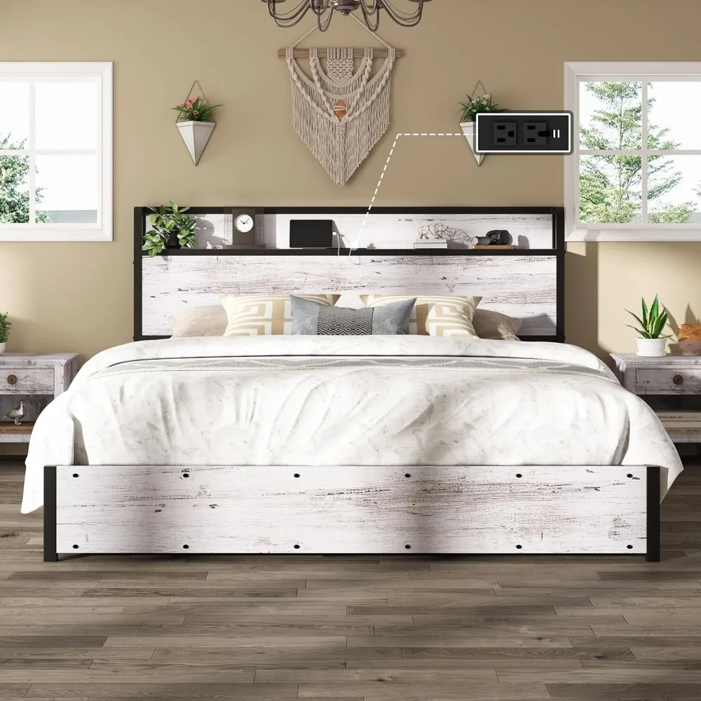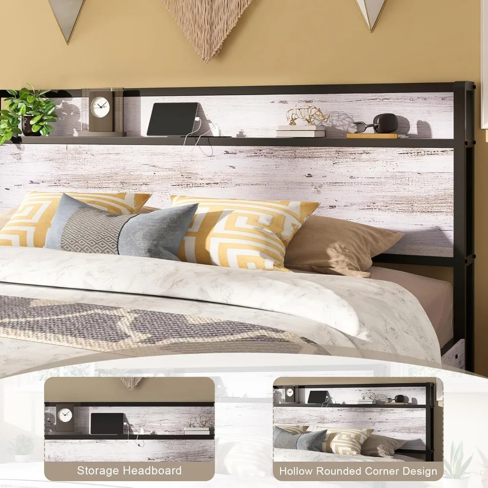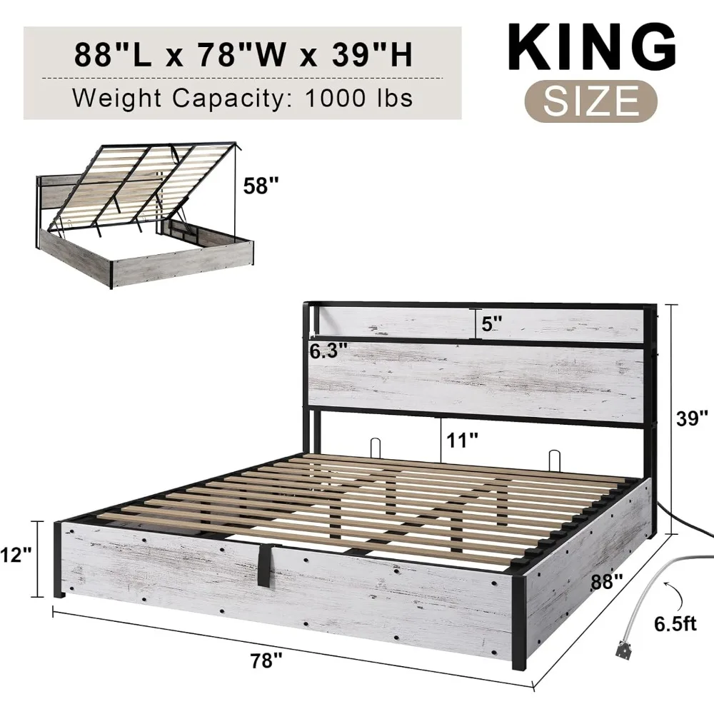 This bed frame is designed with a convenient gas-lift mechanism that allows for easy lifting and prevents the mattress from sliding. It's perfect for small spaces like bedrooms and apartments. The area beneath the bed offers ample storage for suitcases, storage bags, and seasonal items, keeping your room organized and saving floor space. Crafted from high-quality MDF, this storage bed ensures durability and stability, with a natural wood texture that adds a rustic charm to your bedroom. The wooden headboard features open storage space and a charging station, with rounded edges and a hollow design that adds a sophisticated touch to the bed frame. Assembly is straightforward and can be completed by two people in about an hour. The bed frame can support up to 1000lbs with a slat system and does not require a box spring.