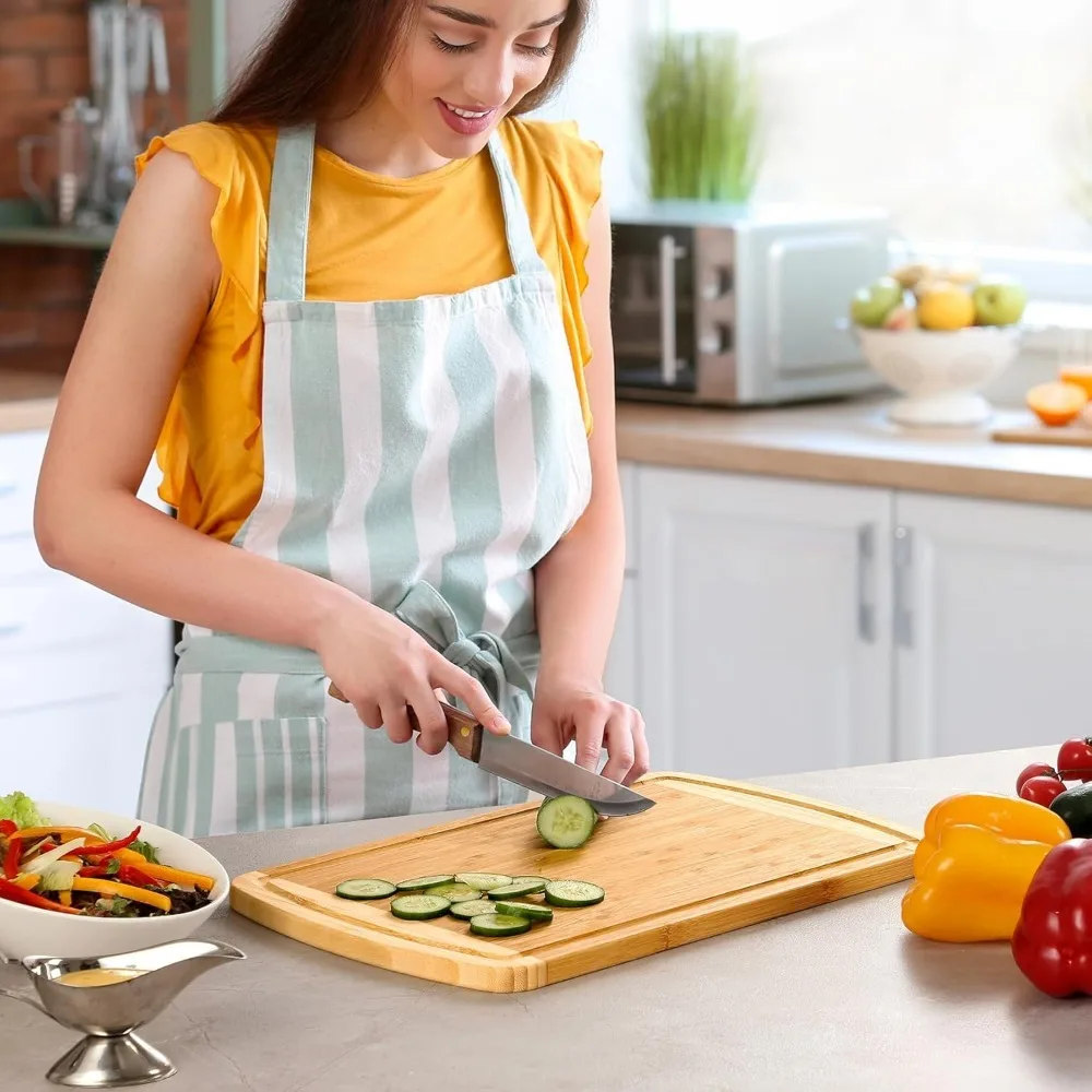 • Gentle on Knives: Unlike glass or plastic cutting boards, our bamboo board provides a smooth knife-friendly surface. It helps maintain the sharpness of your blades, ensuring precise cuts without the dulling, wear and tear.