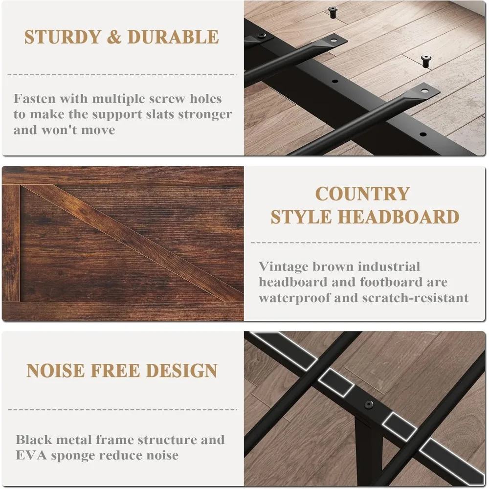 - VINTAGE INDUSTRIAL DESIGN: Embrace an vintage industrial chic vibe with the rustic barn door-inspired wood headboard and footboard, paired with a black metal platform bed frame. Built to last, DOGIBIXO heavy-duty bedframes with 12 horizontal metal support rods and 12 legs evenly distributes weight, supporting up to 1200 pounds. Say goodbye to sagging mattresses and enjoy superior support!