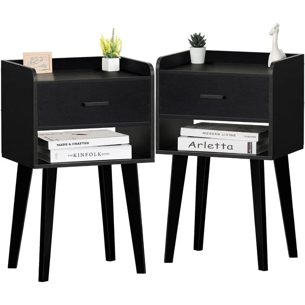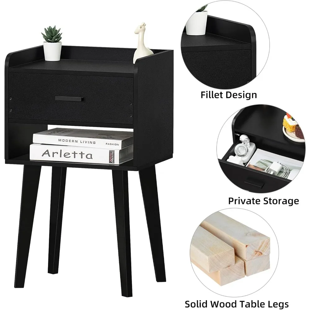 - 🌳【4 Solid wood legs】This side table is a black pearl from middle ages, which has a special solid wood legs design. These four wood legs ensures better load capacity, which ups to 80 lbs. The mid-century black nightstand has a large drawer and also two open spaces, providing more storage options for your storage. The unique solid wood leg design not only ensures the beauty, but also brings strong stability and usability.