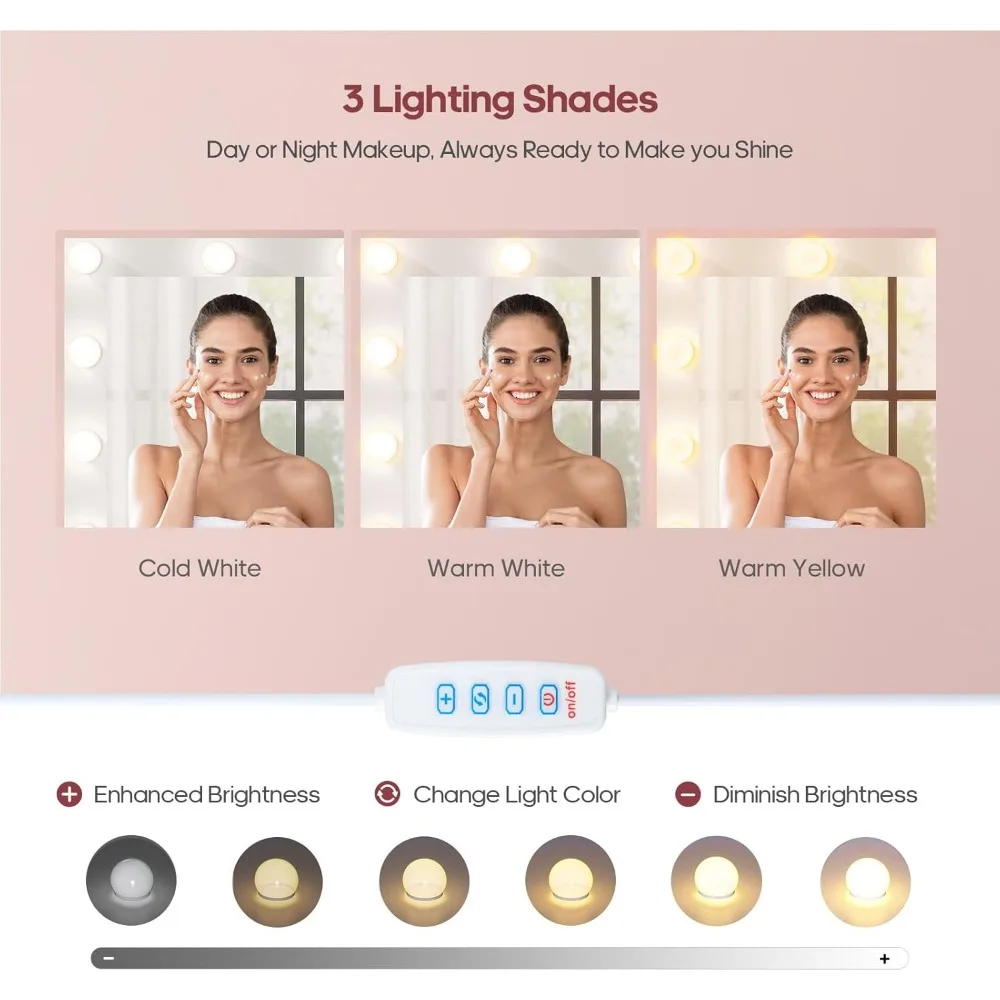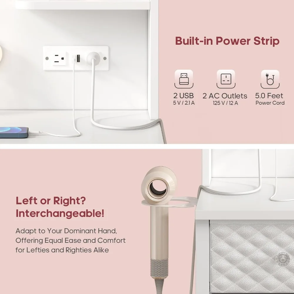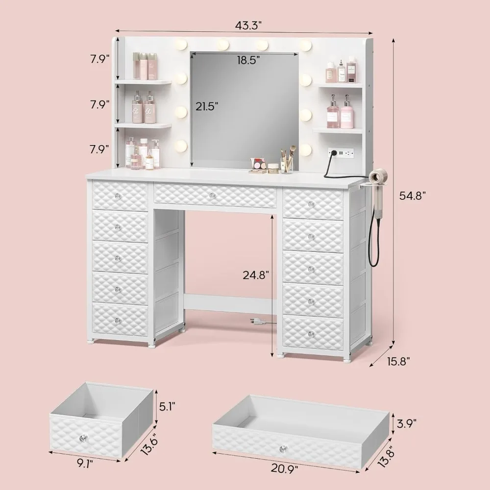 This makeup vanity desk offers a spacious and organized storage solution with 11 drawers and 6 open shelves, perfect for keeping all your beauty essentials tidy and within reach. The desk features studio-quality lighting with adjustable brightness and 3 lighting modes, ensuring flawless makeup application for any occasion. A built-in power outlet keeps your styling tools conveniently close, avoiding messy cords and enhancing your beauty routine. With a classic design, the vanity table boasts a stylish PU checkered pattern and sparkling diamond handles, adding elegance to any room and making it an ideal gift for women on special occasions. Assembly is easy with clearly labeled parts, and the desk measures 15.8"D x 43.3"W x 54.8"H, while the mirror measures 15.8"W x 21.5"H. The desktop and shelves are crafted from FSC-certified wood material.