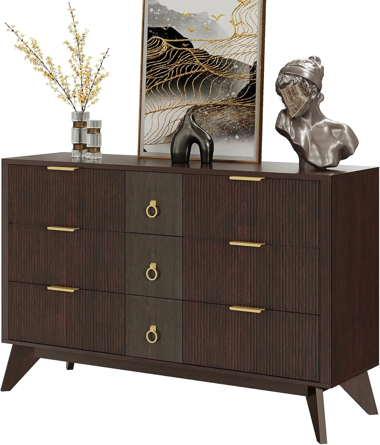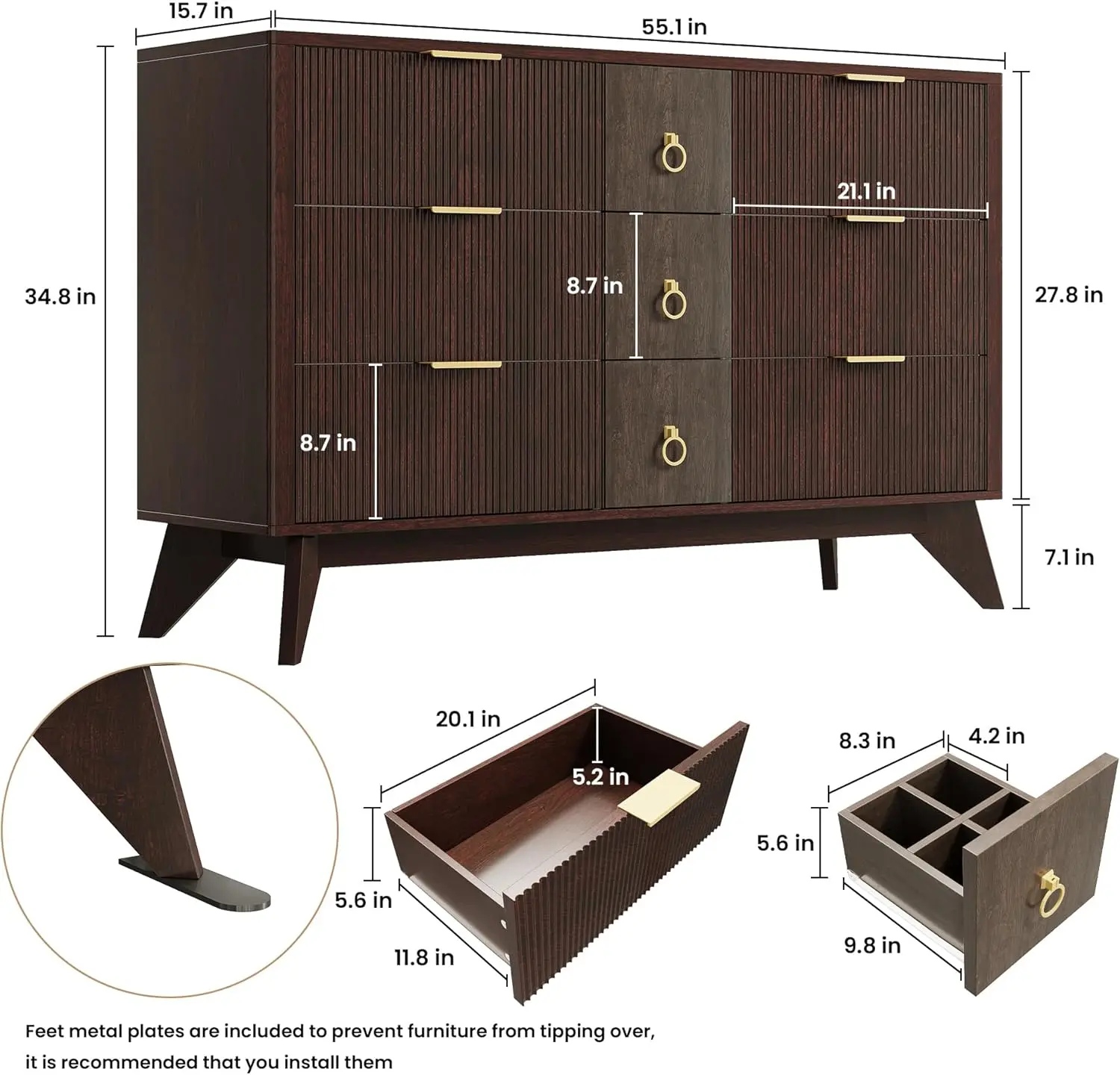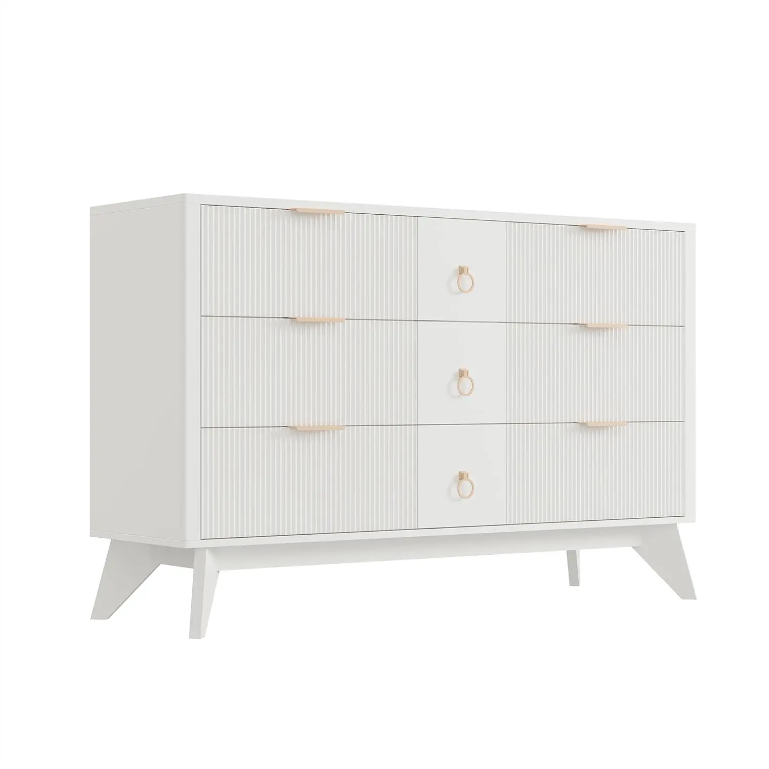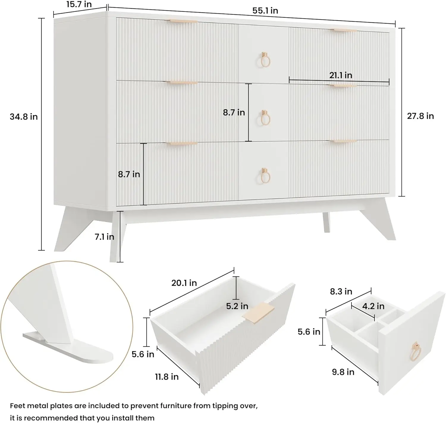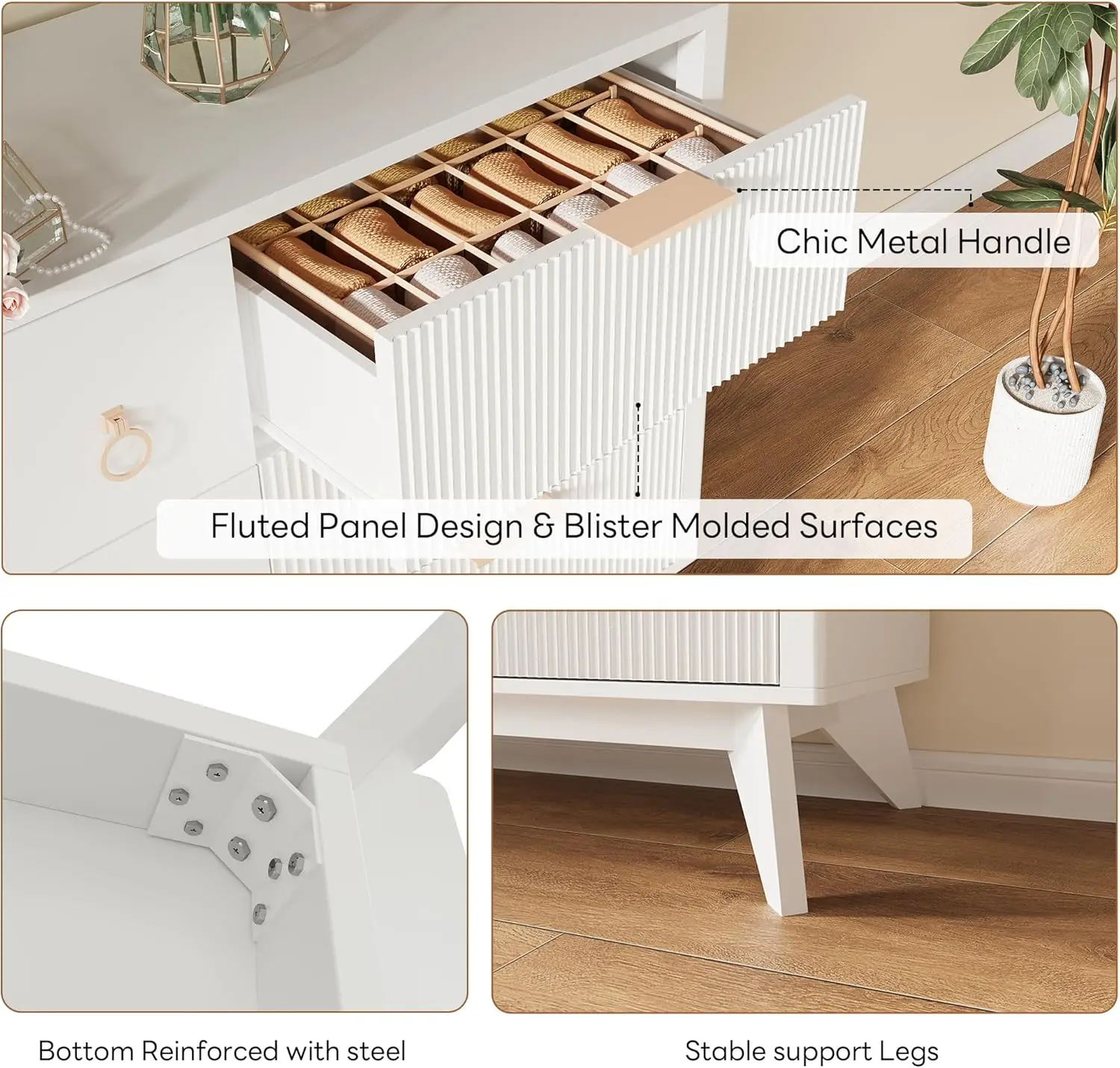 Sturdy and Safe Design: Constructed from MDF and P2 solids, this dresser features metal pulls and textured fluted tops for easy maintenance. Each drawer can hold up to 40lbs and reinforced top can hold up to 200lbs. Duck-claw anti-tip iron and sturdy base ensure safety and stability