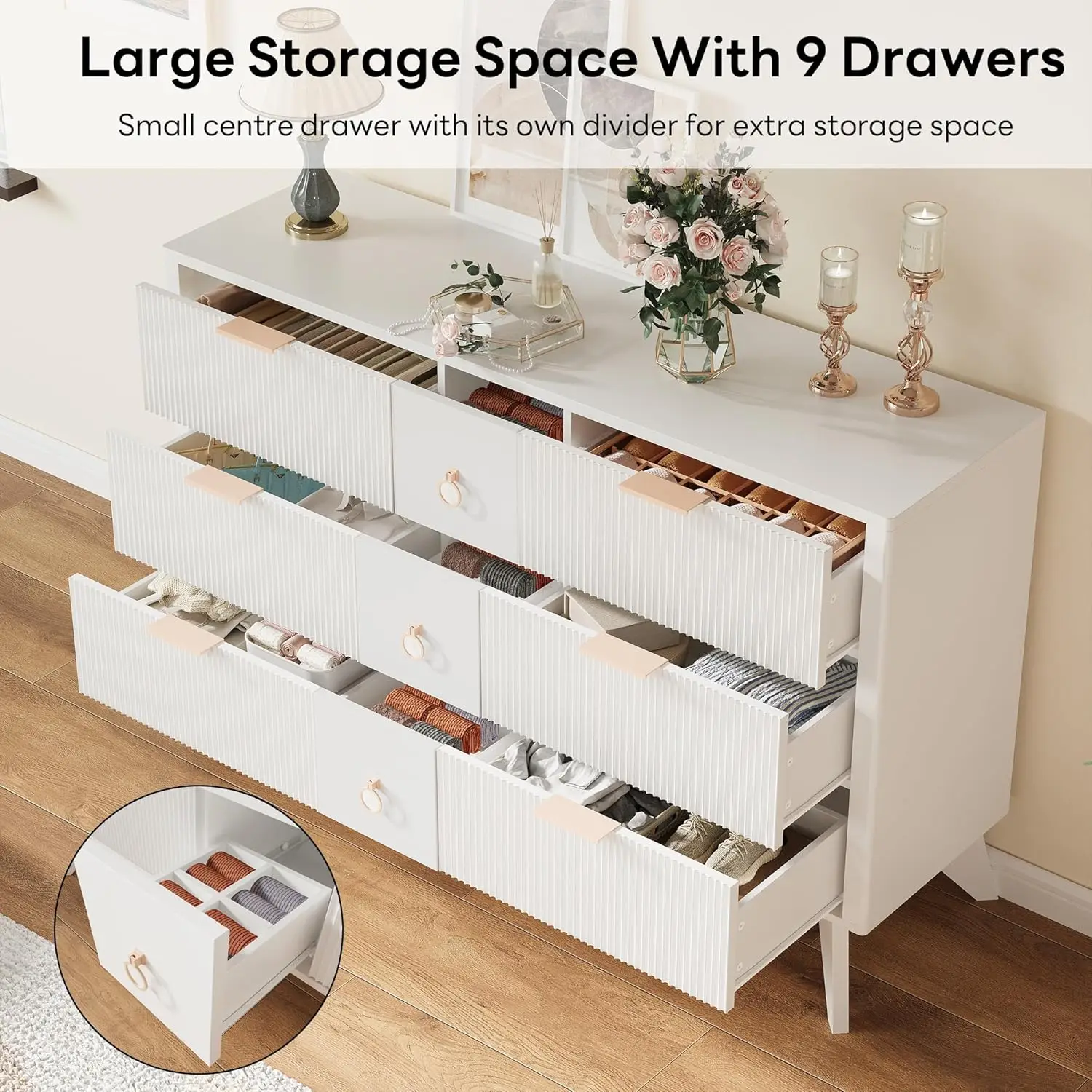 9 Large Capacity Drawers: This 9 drawer dresser provides ample space for clothes, bedding, or cosmetics, with a divided middle drawer for smaller items like socks and underwear. The roomy top panel doubles as a TV stand or display area for decor, keeping your space tidy