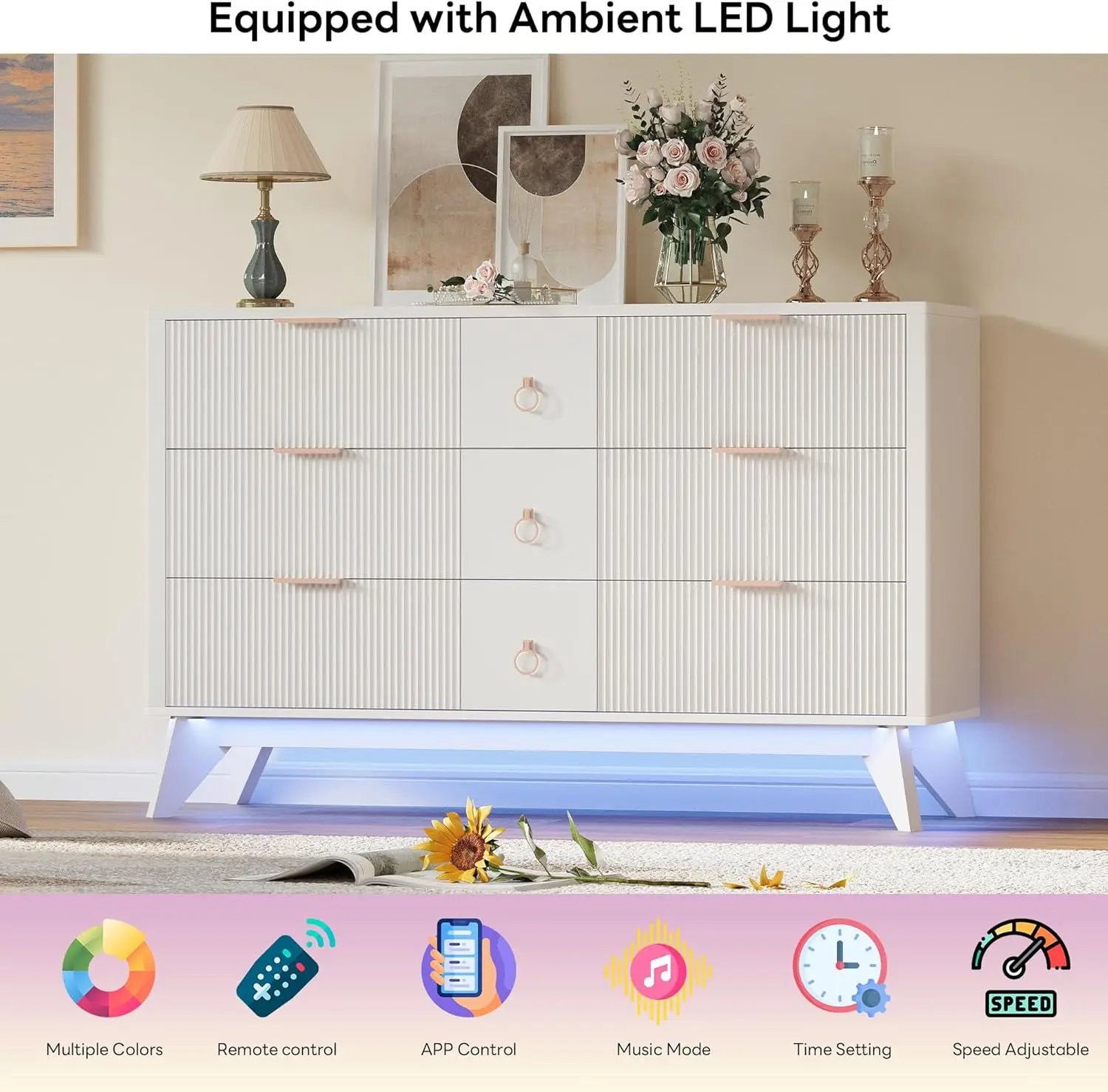 RGB LED Illumination: Hidden multi-coloured LED strips on the bottom with adjustable brightness via button or app. Lights are synchronised with music for a dynamic lighting effect that adds a stylish ambience to your space