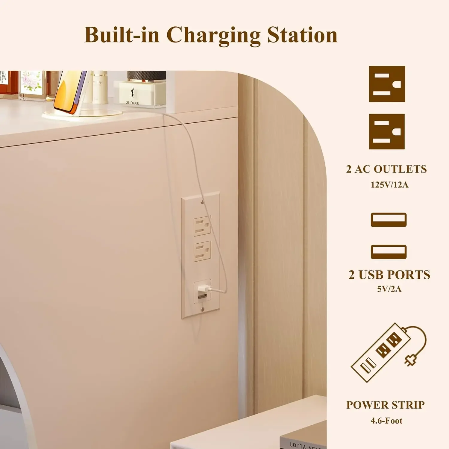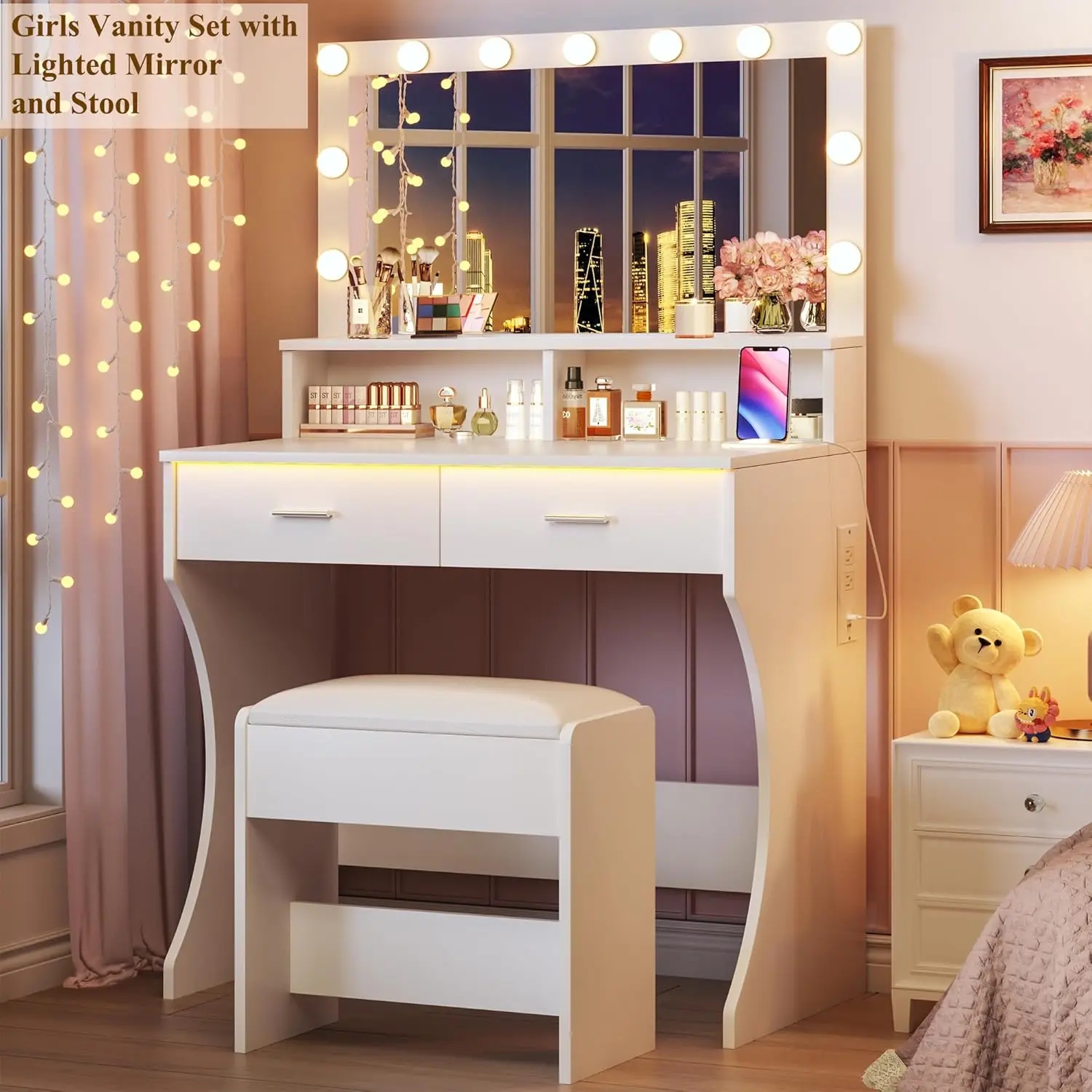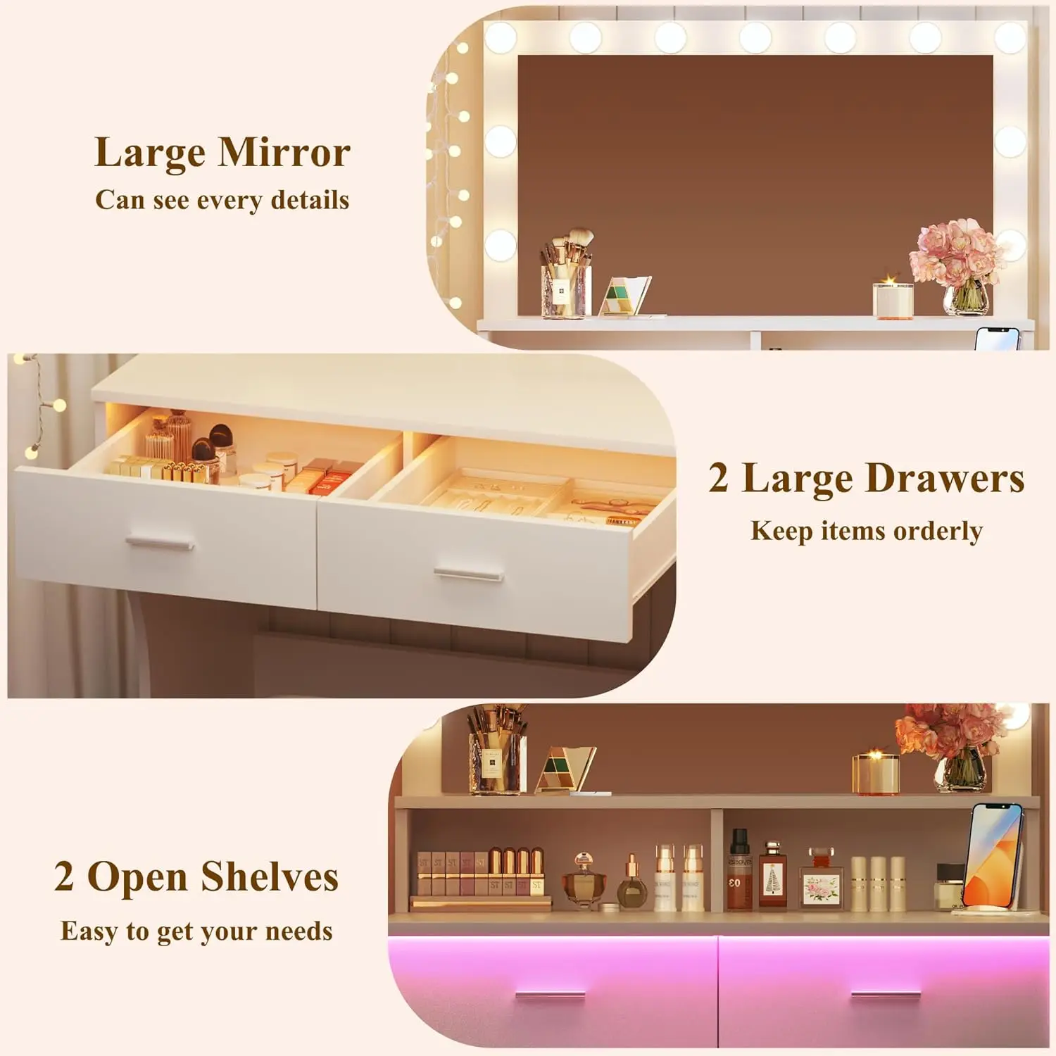 Vanity Desk with Mirror and Lights, Small Makeup Vanity with Chair and RGB Lights, White Vanity Table Set with 2 Drawers & Power Outlets, Open Shelves, 3 Color Modes Adjustable, White
