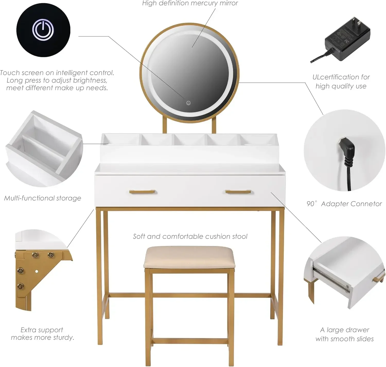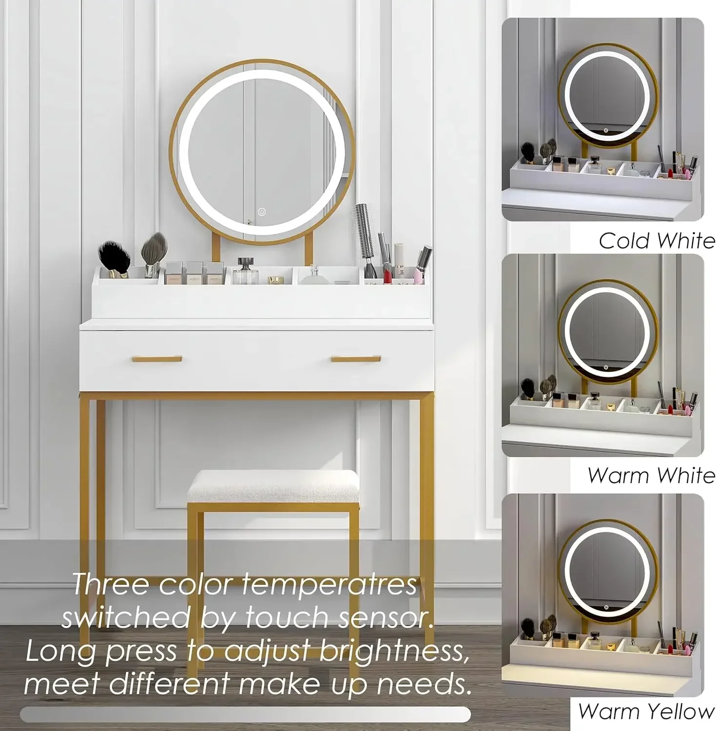 Makeup Vanity Desk with Mirror and Lights, Makeup Vanity Set with Drawers, Small Makeup Vanity Table, 3 Lighting Modes Dresser Desk and Cushioned Stool Set for Bedroom White and Gold
