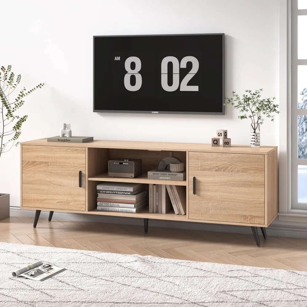 - Modern Mid Century TV Stand: Featuring a classic two-door design with a mid century look and pine legs, the simple lines of the long TV stand design can easily be incorporated into a variety of decorative aesthetics to enhance the look of any room.