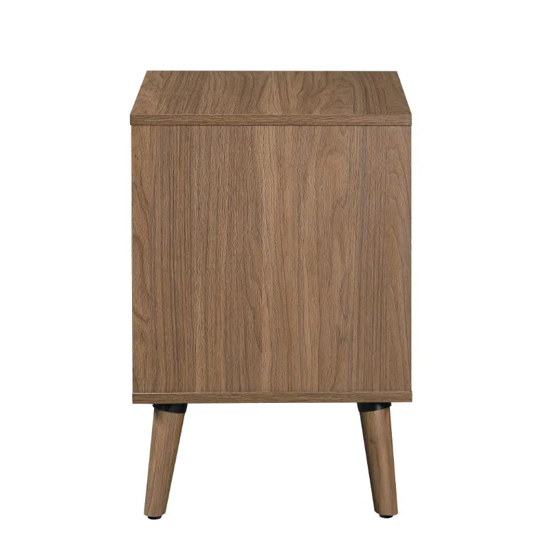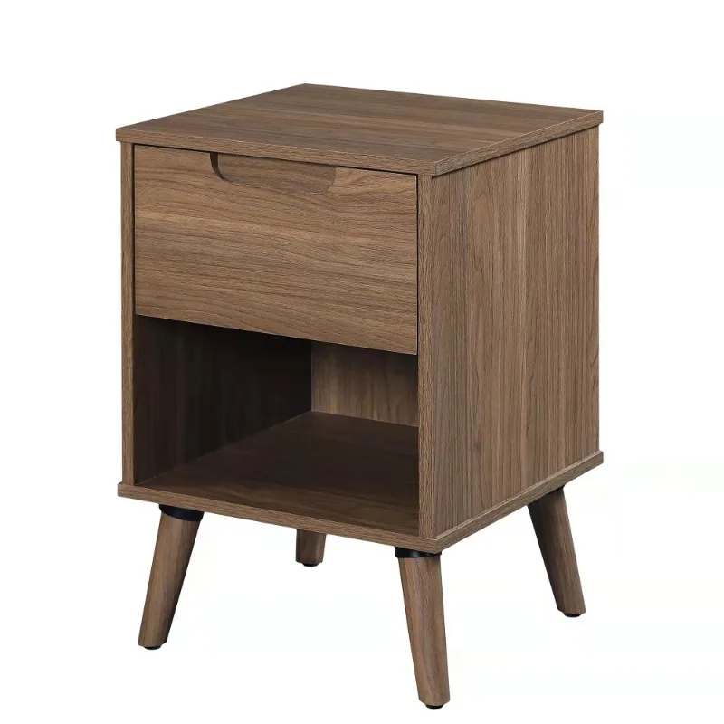 Keep your bedroom essentials within arm's reach with the Modern Nightstand with Drawer. This Nightstand is a convenient addition to your bedroom as it not only provides extra storage space, but the modern simple style and beautiful walnut finish fits into any style of room with any existing decor. This nightstand is constructed of laminated wood for a cost effective build that is both trendy and functional. It with one drawer feature ball bearing slides that offers extra space that provides easy access for remotes, your favorite book and reading glasses, etc. With an open shelf under the drawer, you can stack of books, or any decorative item you wish to put on display. Use the top surface to place a lamp on, or use it to display a few accessories for added style. Assembled product size is 15.75"*15.75"*24"H. Pair this nightstand with other accent pieces from the Modern collection to create the bedroom haven of your dreams.