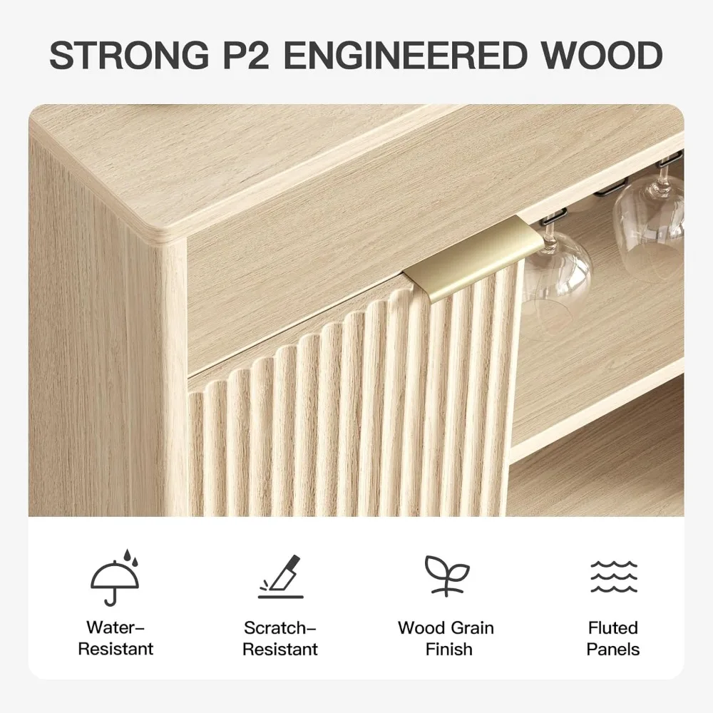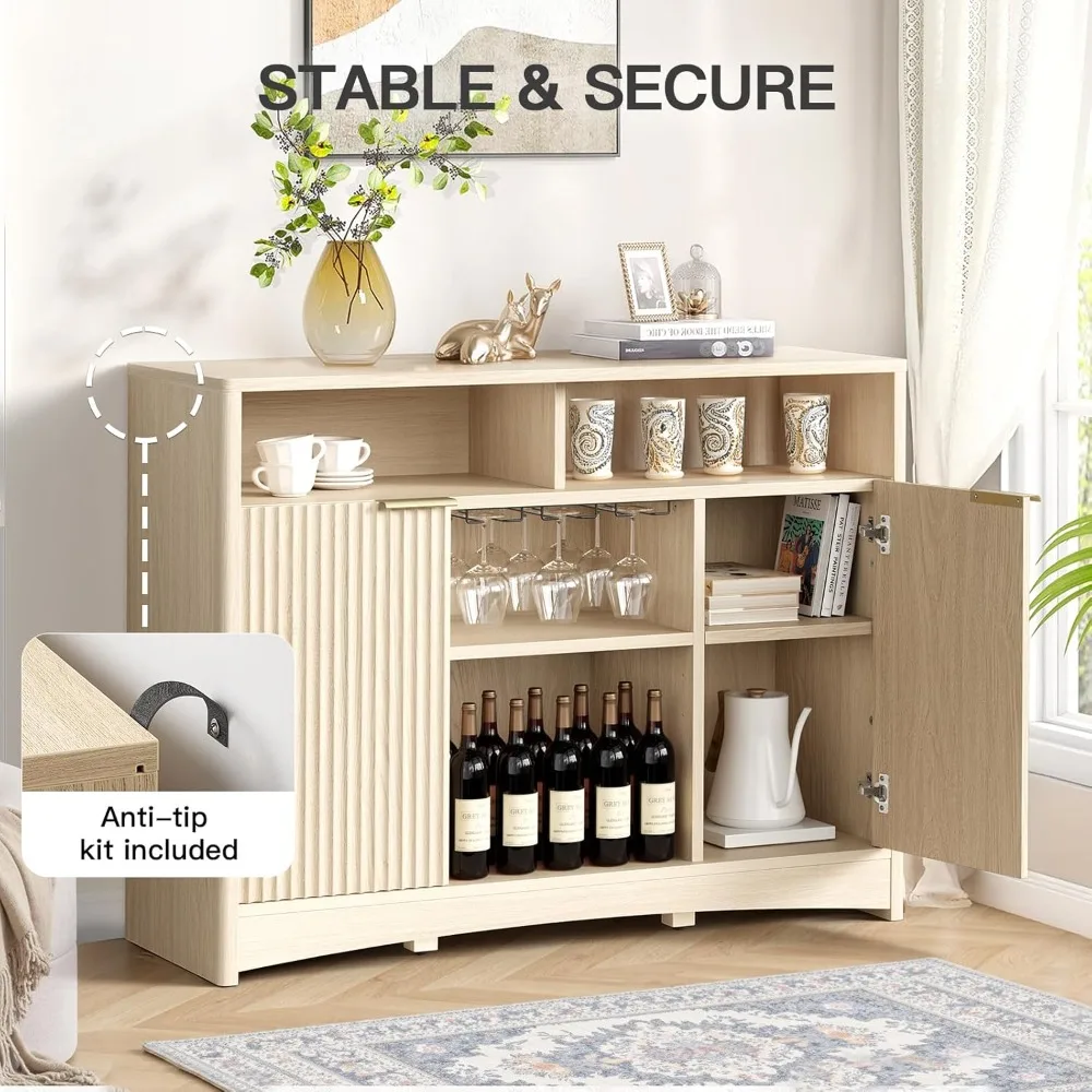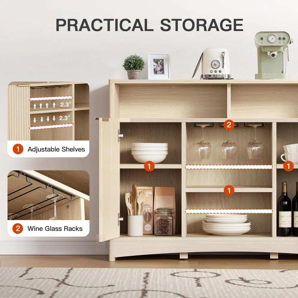 Modern Coffee Bar Cabinet with Storage, Fluted Wood Buffet Sideboard with Wine and Glass Rack, Li...