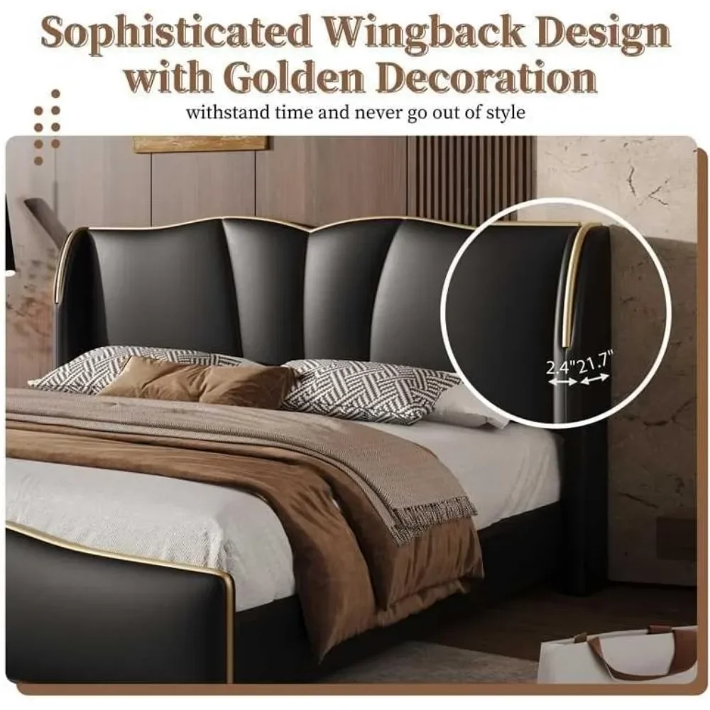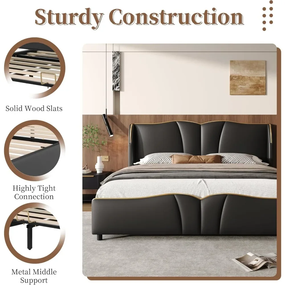 Modern Luxury Leather Platform Bed Frame - Wingback Headboard & Wavy Footboard, No Box Spring Req...