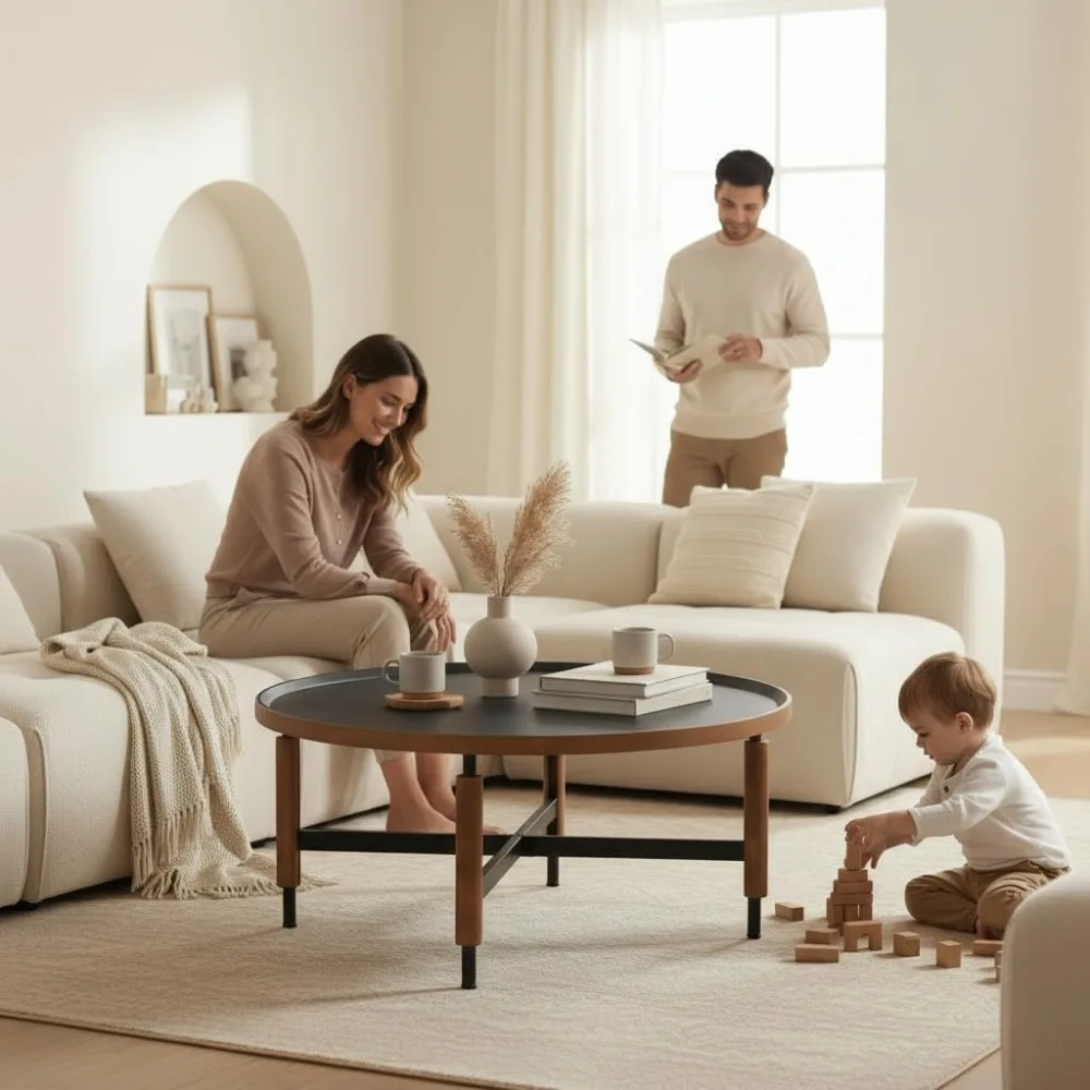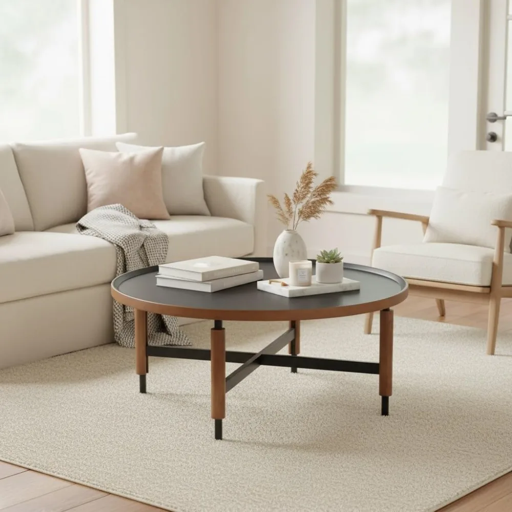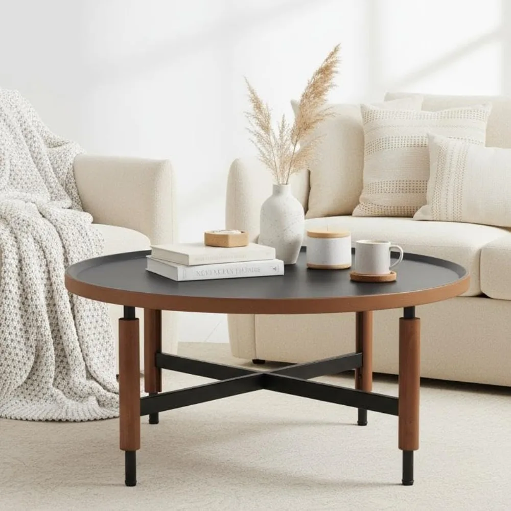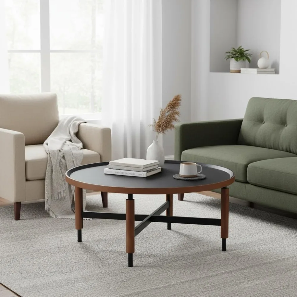 This coffee table boasts a modern design with a round wooden top and black cross legs, offering a stylish fusion of rustic and contemporary styles for your living room. Crafted with high-quality materials, it features a premium woodgrain finish that emulates the look of natural walnut, ensuring both durability and an elegant appearance. Measuring 31 inches in diameter and standing at 13.5 inches tall, this table is well-proportioned for any living room setup and provides ample space for your needs. Assembly is a breeze with clear instructions and hardware included, allowing for quick setup. Its classic circular shape with vintage-inspired details makes it a versatile centerpiece that enhances various interior design styles.