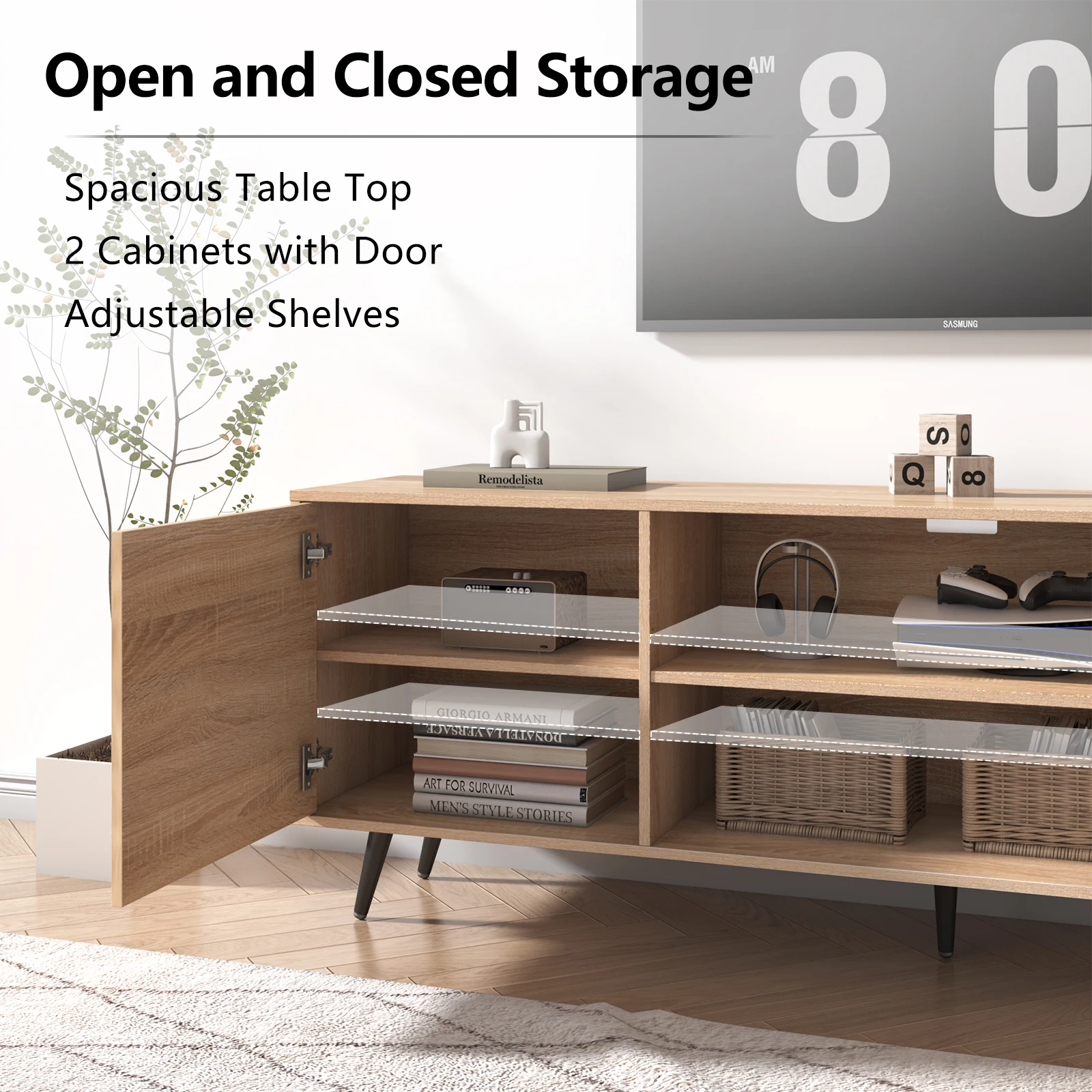 Large Storage Space: This entertainment center has two open shelves and 2 spacious cabinets to store DVDs, media players or gaming devices. Everything is in one small space and all 3 shelves are height adjustable. The bottom-to-floor clearance is 3 inches, making cleaning all the easier.