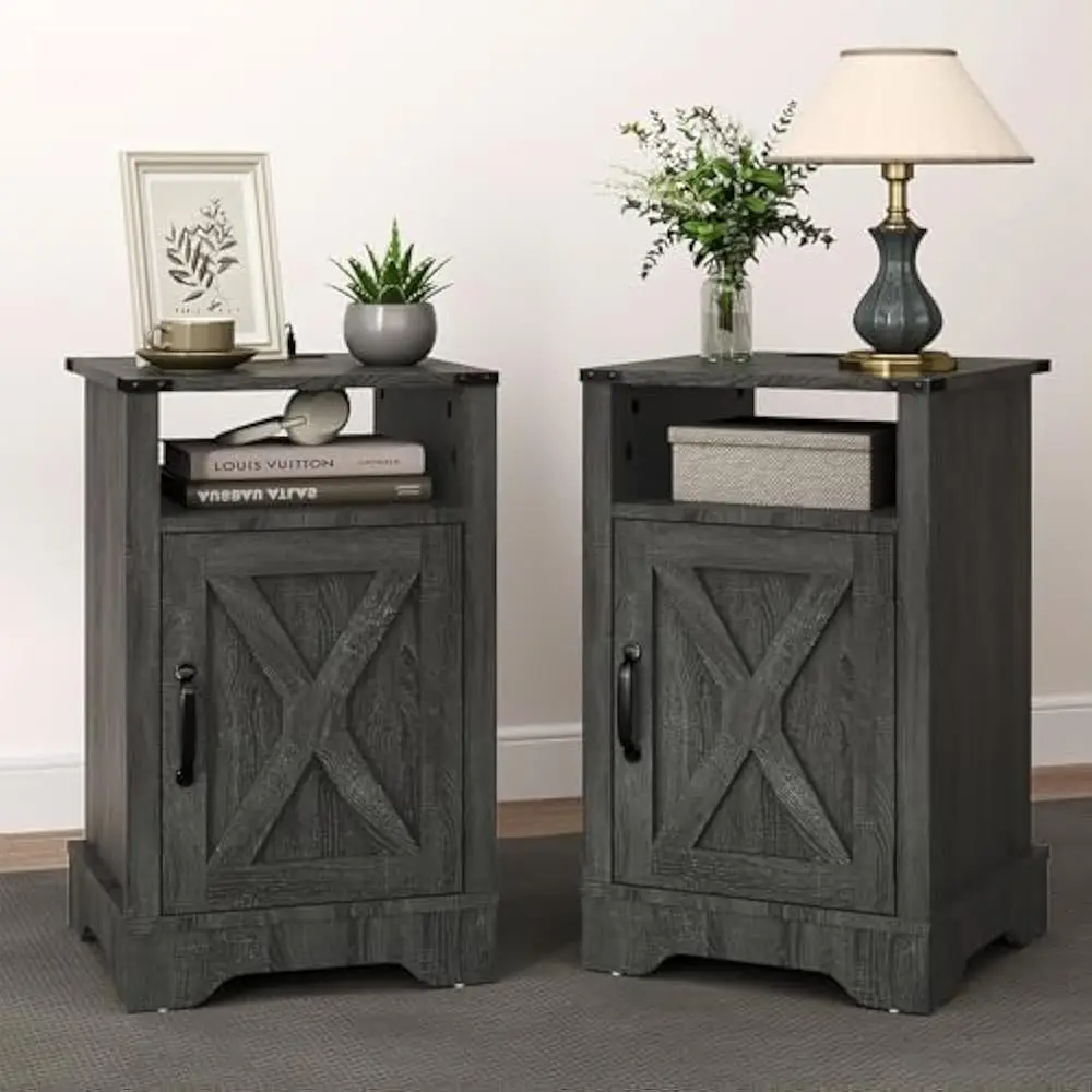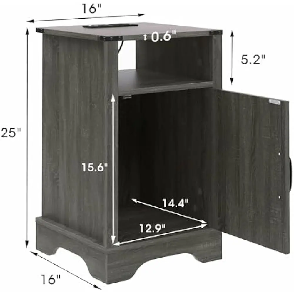 Nightstand Set of 2, End Table w/Charging Station, Tall Farmhouse Bedside Tables with Large Storage and Shelf, Wooden Side Table