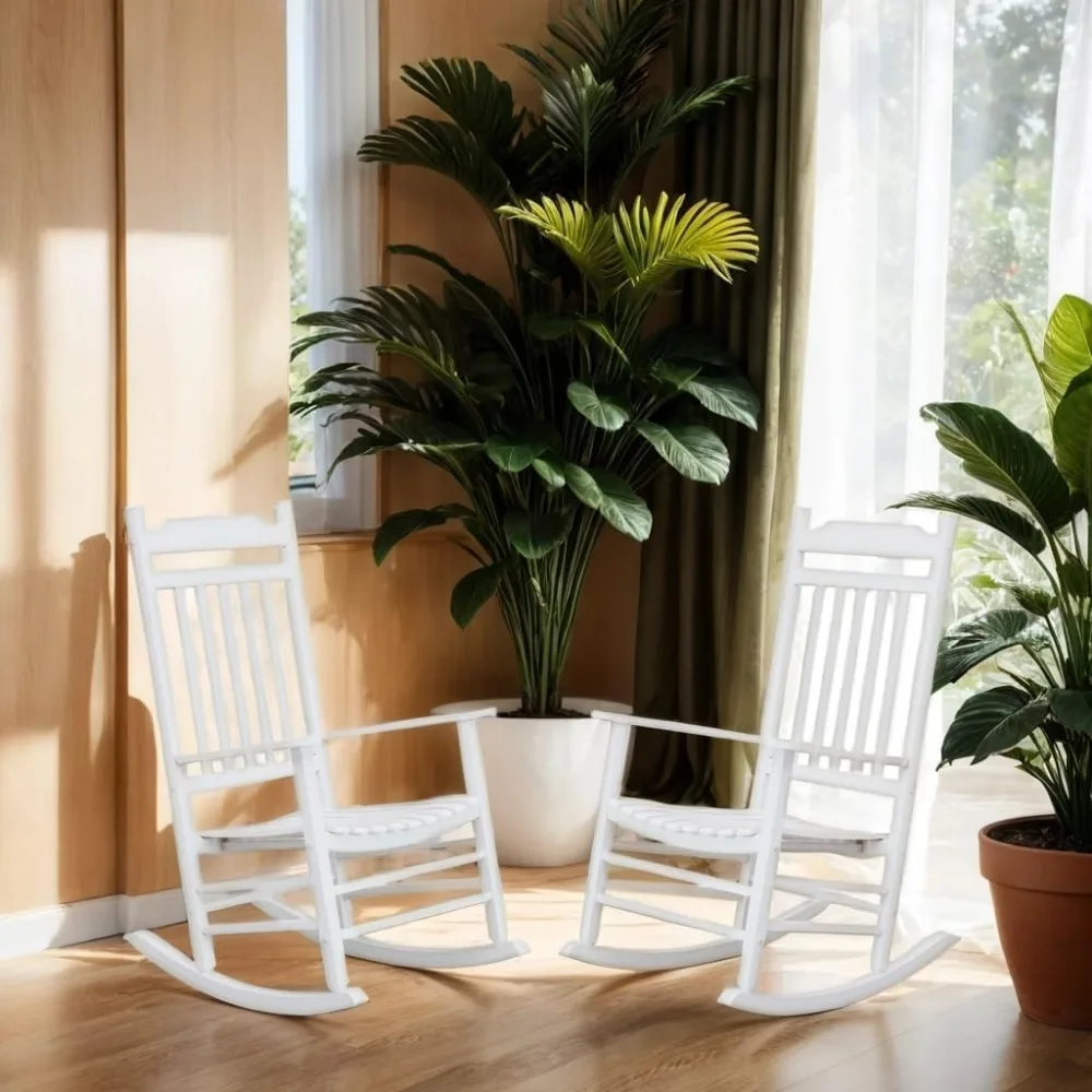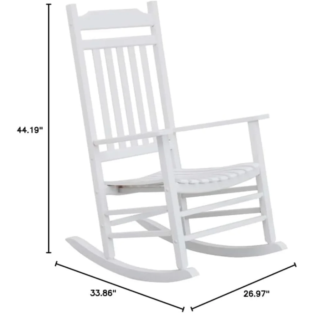 This classic rocking chair offers a timeless design with vertical slats and a smooth rocking motion, enhanced by wide armrests for added support and comfort. The chair's design blends traditional charm with a contemporary touch, making it a versatile addition to any home decor. Made from high-quality poplar wood, it is both sturdy and durable, with a lead-free varnish finish that ensures safety and easy maintenance. Ideal for both indoor and outdoor use, this chair is perfect for porches, patios, bistros, camping, or simply enjoying the outdoors on your balcony. It measures 34 inches in depth, 27 inches in width, and 44.5 inches in height, and can support a weight capacity of up to 250 pounds, making it suitable for adults of various sizes. Assembly is straightforward, with all necessary tools and clear instructions included, allowing for quick and easy setup without the need for professional tools, so you can start enjoying the chair's comfort right away.