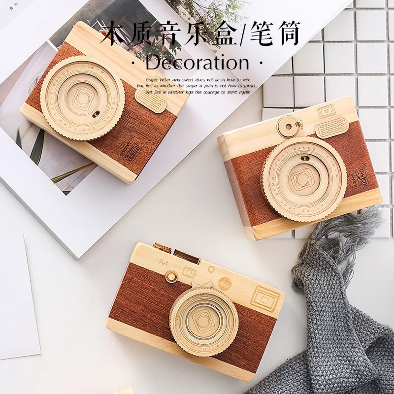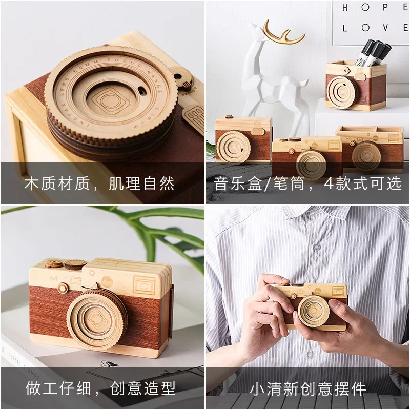 New 1Pc Creative Retro Camera Double-layer Pen Holders Original Wood Learning Stationery Storage Container Desk Gift Ornaments