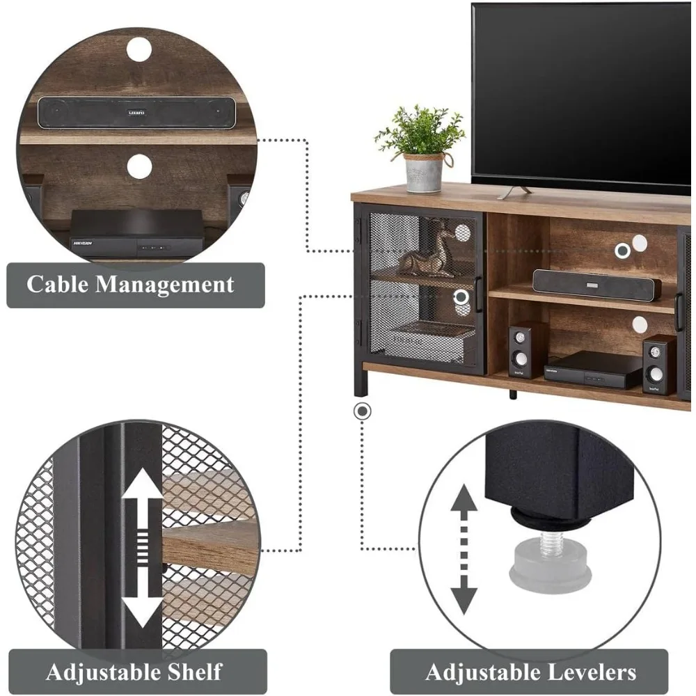 • [60 Inch Wide TV Stand]: This TV stand features a 60" wide wood top that can easily accommodate flat-screens up to 70". And two industrial-inspired mesh doors on either end opens to give you an ample space to display your DVDs and board games, while two central shelves are ideal for media players and consoles. Cable management cutouts also help to keep wires free of clutter.