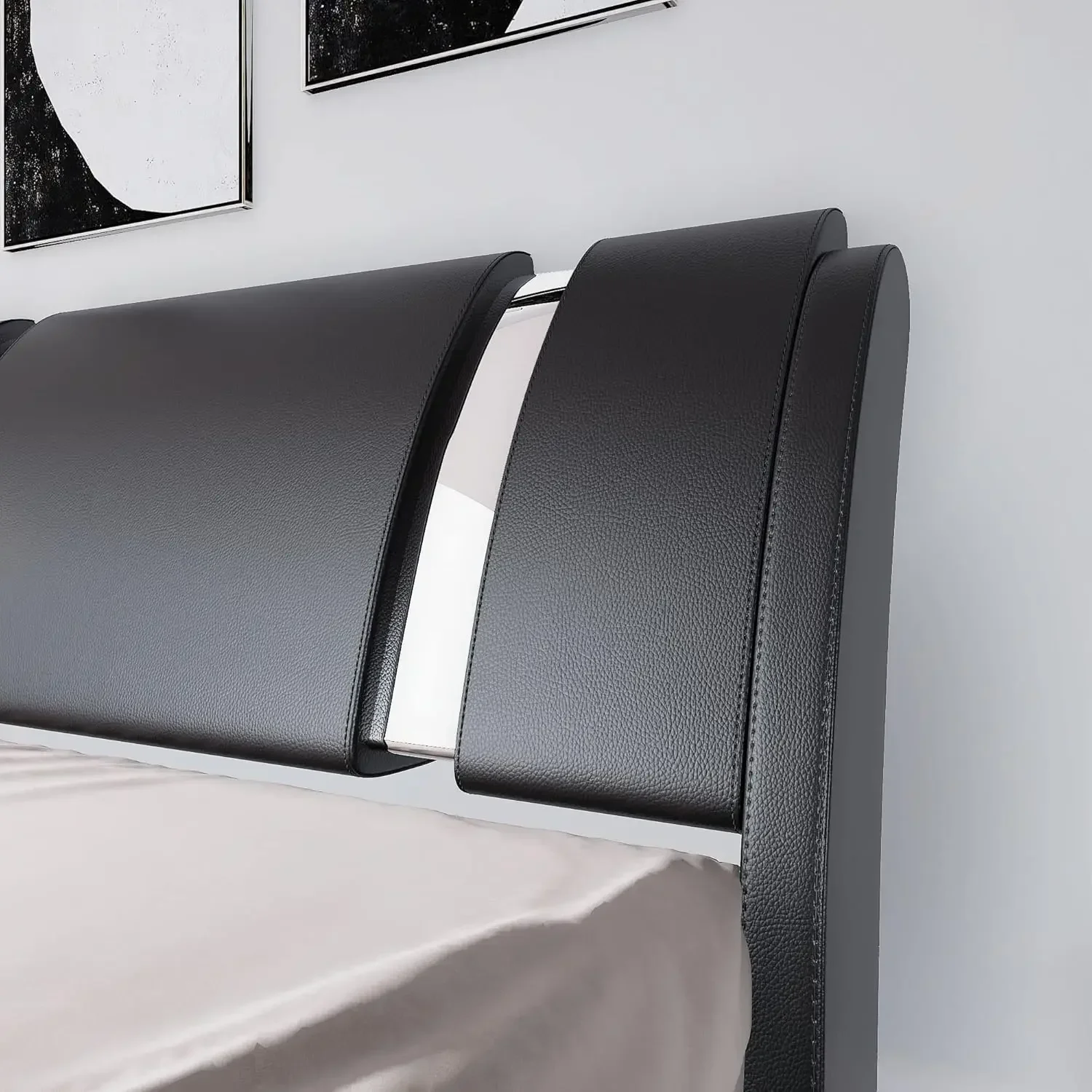 Queen Bed Frame with Iron Piece Decor, Faux Leather Upholstered Platform Bed with Adjustable Headboard & Strong Wooden Slats, No Box Spring Needed, Black