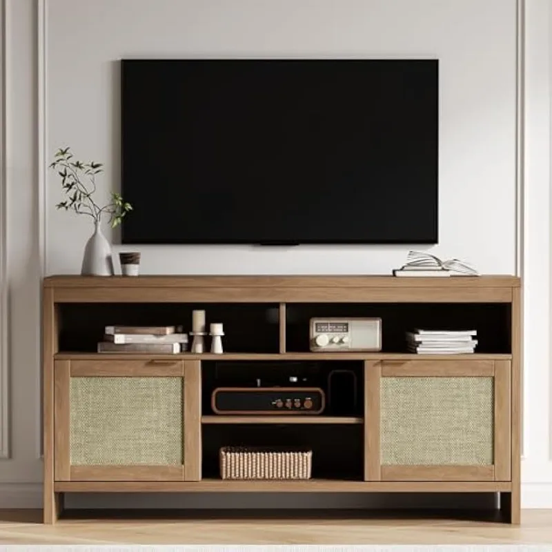 Stylish Design: Featuring a rich rustic brown finish that highlights a stunning wood grain, this farmhouse TV stand adds warmth to any living space. The rattan door panels blend traditional charm with modern aesthetics, creating a unique focal point.
