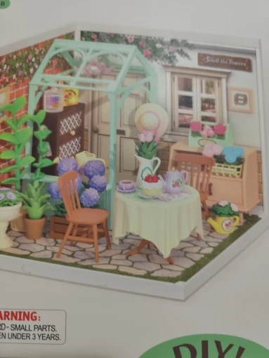 Step into serenity with this enchanting tea garden scene. Featuring realistic tea tables, an elegant tea set, lush potted plants, and blooming flowers, this miniature setting captures the tranquil charm of a classic garden retreat. Details like a brick-patterned floor and an openable cabinet bring an extra touch of realism to your collection.