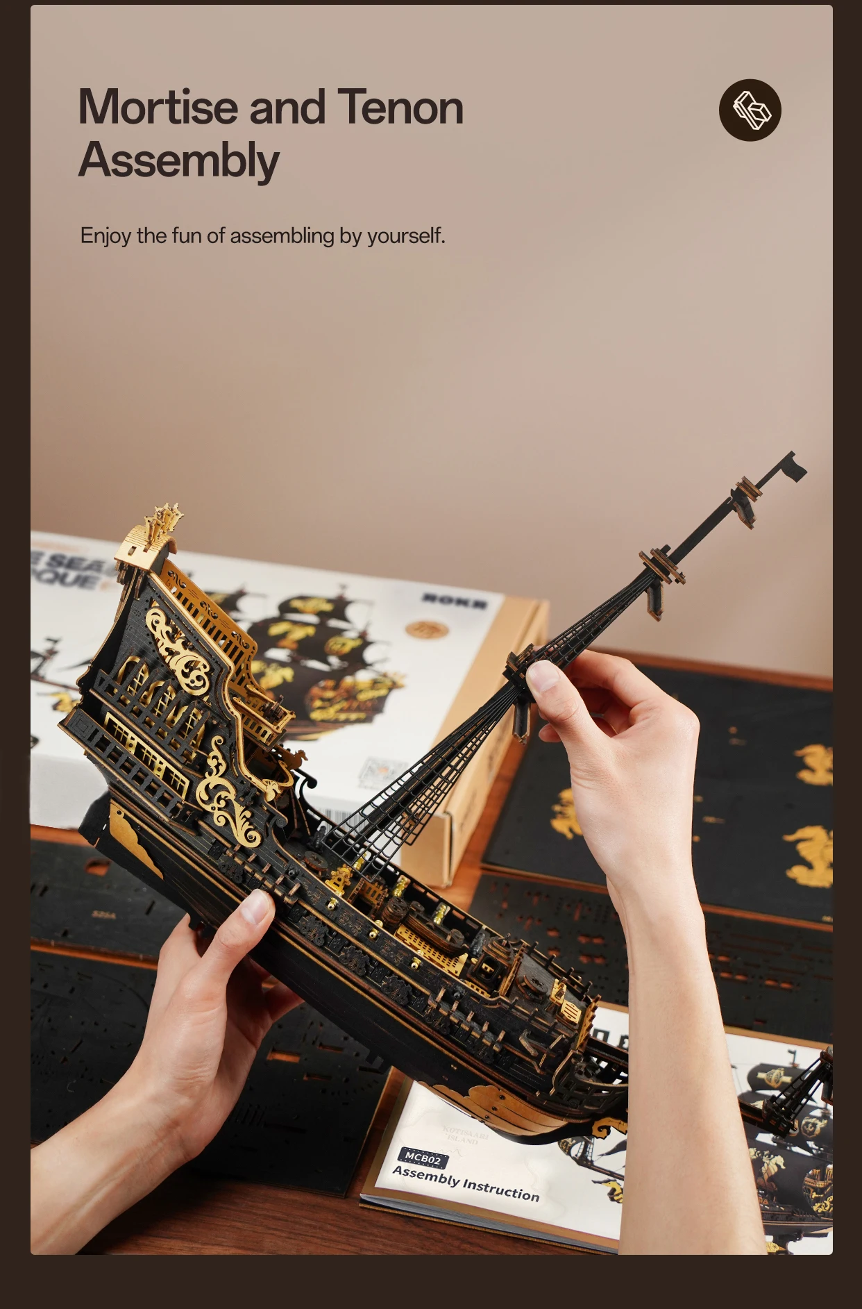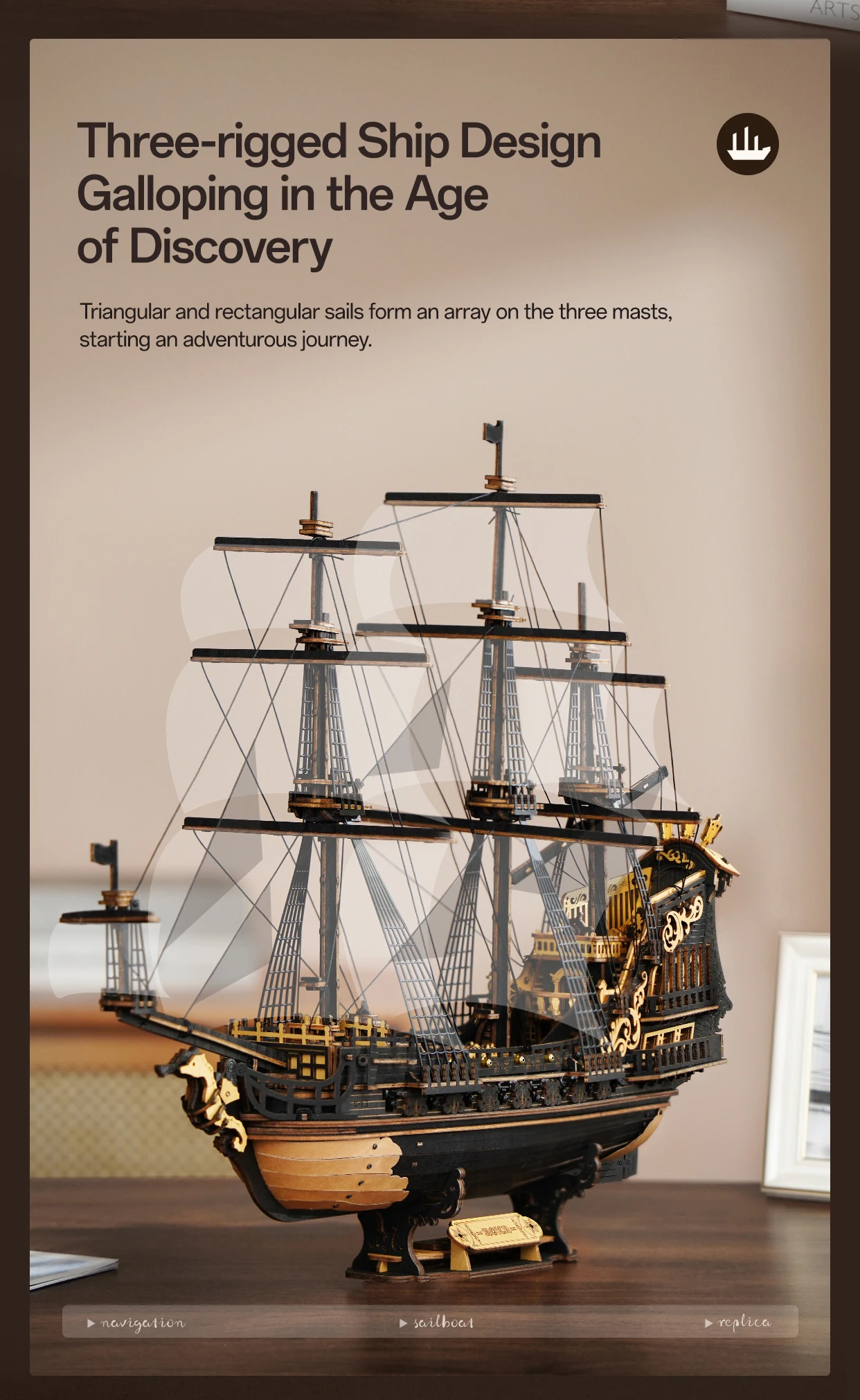 The three-masted sailing ship, immortalized by the French literary giant Victor Hugo as a "great human masterpiece," was born during the Age of Exploration. It stands as an irreplaceable protagonist on the new maritime routes, with adventurers traveling between the old and new continents, navigating the vast oceans. The Seahorse is the latest creation in ROKR's Wheel of the Century series. Its deck features three towering masts, with eight horizontal and five vertical sails arranged along them to form a powerful and majestic array. The hull is coated in a sleek jet-black finish, complemented by gold foil accents on select planks, while ten meticulously arranged golden cannons add an air of authority and grandeur. Inside, ambient lighting creates a mysterious glow in the darkness, casting subtle shadows that interplay with the sails, masts, and flags, blending into a seamless whole.