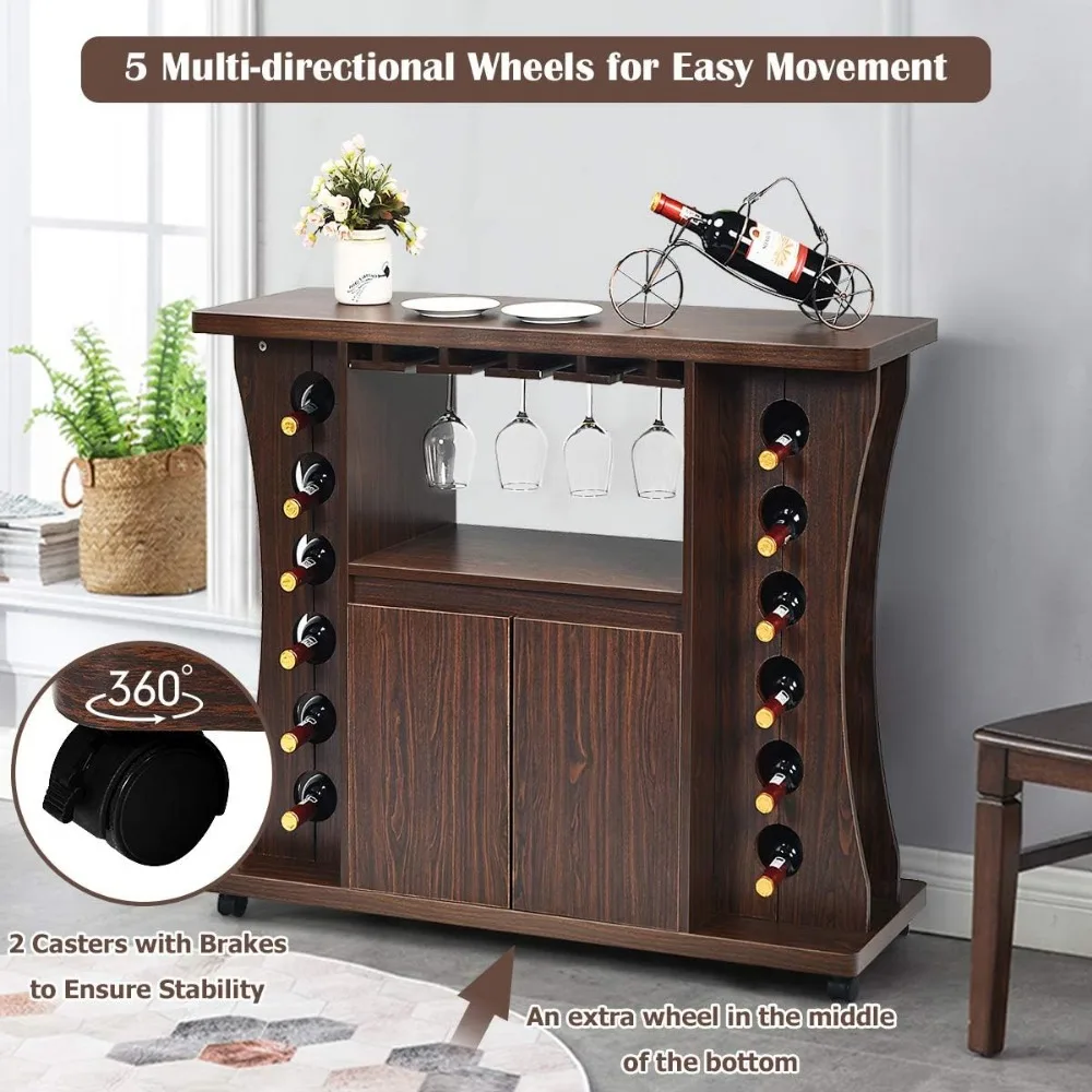This item features ample storage space with wine racks on both sides, capable of holding 12 standard wine bottles for optimal protection. It also includes a wine glass holder for convenient storage and a cabinet designed to keep delicate tableware secure. The buffet is equipped with 360° swivel casters for easy mobility, including 5 universal wheels with 2 lockable ones for added stability. Made from premium engineered wood, this sturdy and durable sideboard can support up to 110 lbs without wobbling, and its rounded corners provide added safety. Versatile in use, this piece can serve as a wine cabinet, kitchen cart, buffet sideboard, or console table, blending seamlessly into any modern and elegant decor. Assembly is straightforward with clear instructions, and the smooth, waterproof surface is easy to clean with a damp cloth.