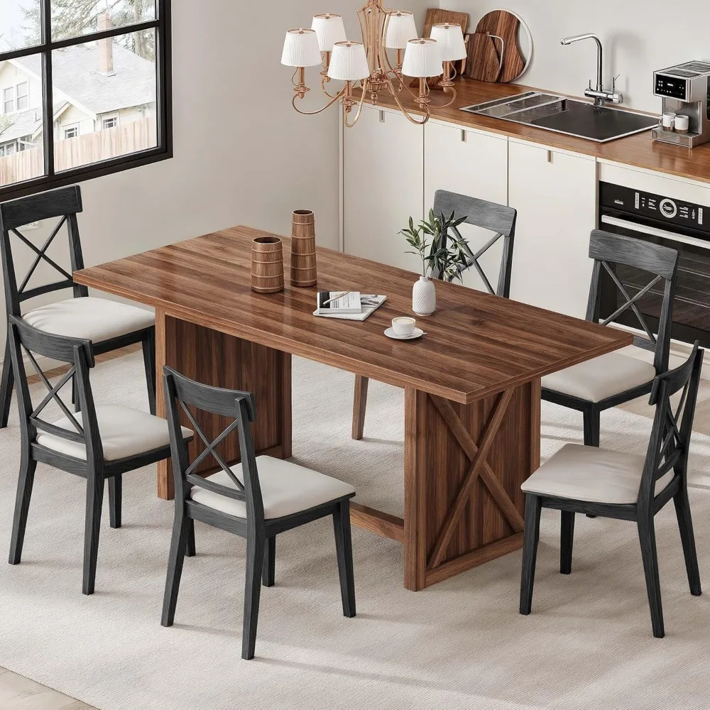 This dining table showcases a charming farmhouse style with its vintage wood veneer and simple X-shaped side design, making it a versatile piece that can blend with a variety of home decor. Whether you're aiming for a rustic or modern look, this table is perfect for seating 6 to 8 people comfortably. Its generous dimensions of 70.86 inches wide, 31.5 inches deep, and 29.52 inches high provide ample space for meals, gatherings, and even decorative items. Beyond being a beautiful dining table, it can also function as a kitchen table, computer desk, or conference table, making it suitable for various rooms in your home. Constructed from high-quality, thick high-density fiberboard, this table is both sturdy and durable, with a smooth surface that can support up to 330 pounds. The adjustable leg pads ensure stability on uneven floors and prevent damage to your flooring. Assembly is straightforward with clear instructions and labeled parts, making the setup process easy and hassle-free.