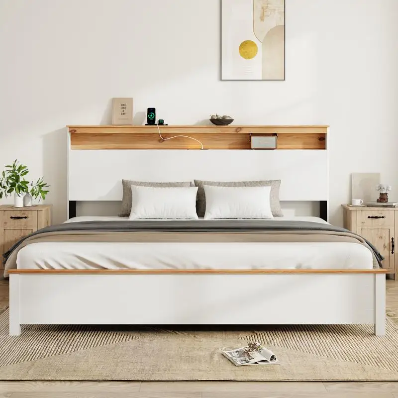 Storage Headboard with Charging Station:This rustic farmhouse bed framewith storage headboard is equipped with a built-in charging station,includinga USB port and a type-C port,allowing you to charge various electronicdevices within easy reach.