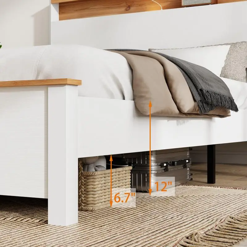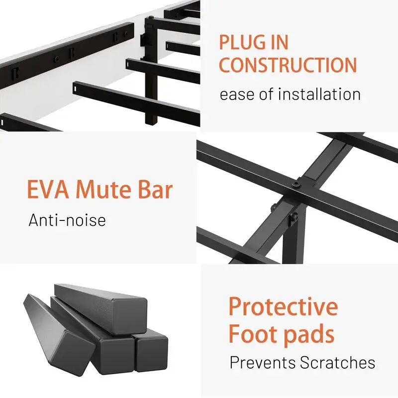 Noise Free & Under-bed Storage: The heavy-duty wood slats are designed toevenly distribute weight and maintain stability, effectively reducing any noiseor squeak. 6.5 in under-bed storage provide space for storing your items, andis easy to clean.