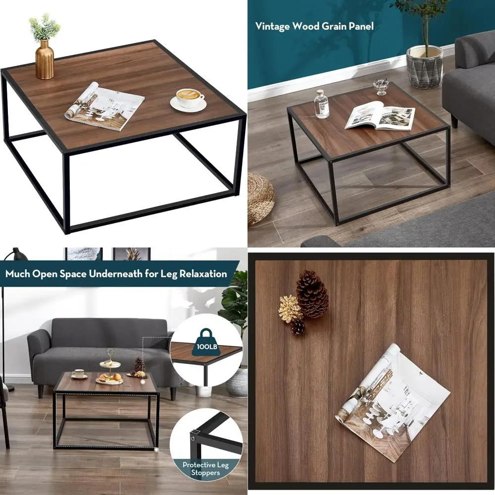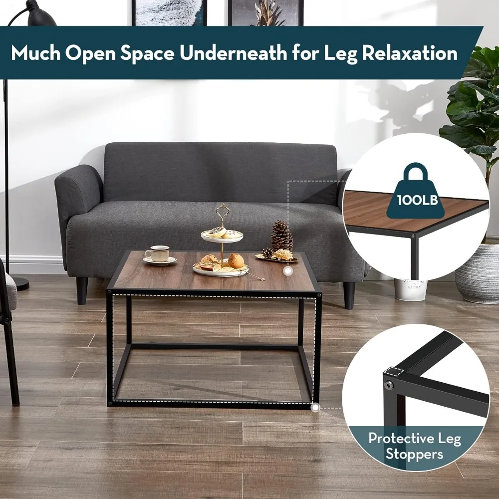 This coffee table is designed for easy assembly, with a pre-installed top that takes only 5 minutes to set up, resulting in a simple yet elegant piece of furniture. Its modern retro style makes it versatile for various spaces, including living rooms and offices. Measuring 27.6 x 27.6 x 15.7 inches, it fits well in both large and small spaces. The coffee table features a walnut wood top paired with a black matte metal frame, embodying a minimalist design with clean lines that remain timeless. The open design beneath the table offers ample space for comfortable legroom.