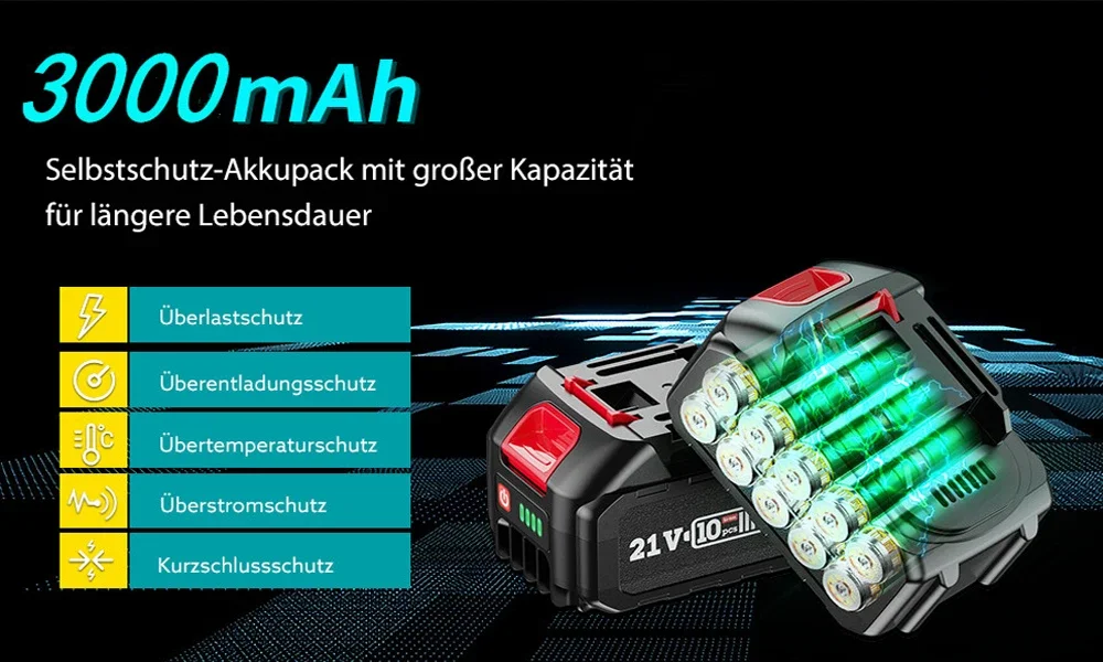 Extraordinary battery life: we know that the battery life of the saw is your most important concern. Our chainsaw is equipped with two 21 V 2 x 4000 mAh batteries, with which you can continuously cut more than 100 pieces of wood. Overheating protection ensures a much longer battery life. The battery status indicator is located on the battery to easily check the charging status.