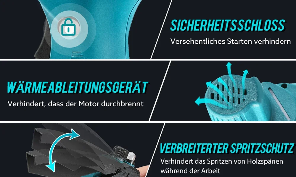 More safety and less noise: this mini chainsaw with battery has a safety lock switch and a splash guard. To prevent accidental starting, the safety lock and trigger must be pressed simultaneously to start the saw. Splash guard prevents sawdust from splashing while working. The noise is very low, so you don't have to worry about disturbing your neighbours.