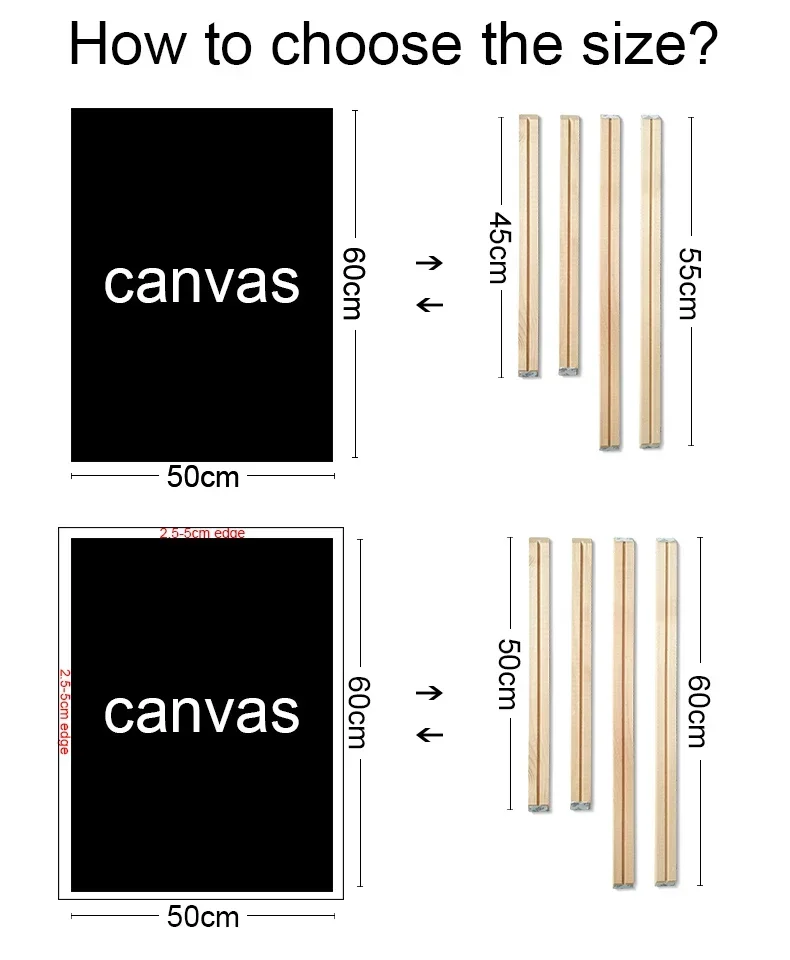 (please make sure your painting has an extra edge of 2.5 cm, I mean the size of canvas should be at least larger than the size of 5 cm wooden frame)