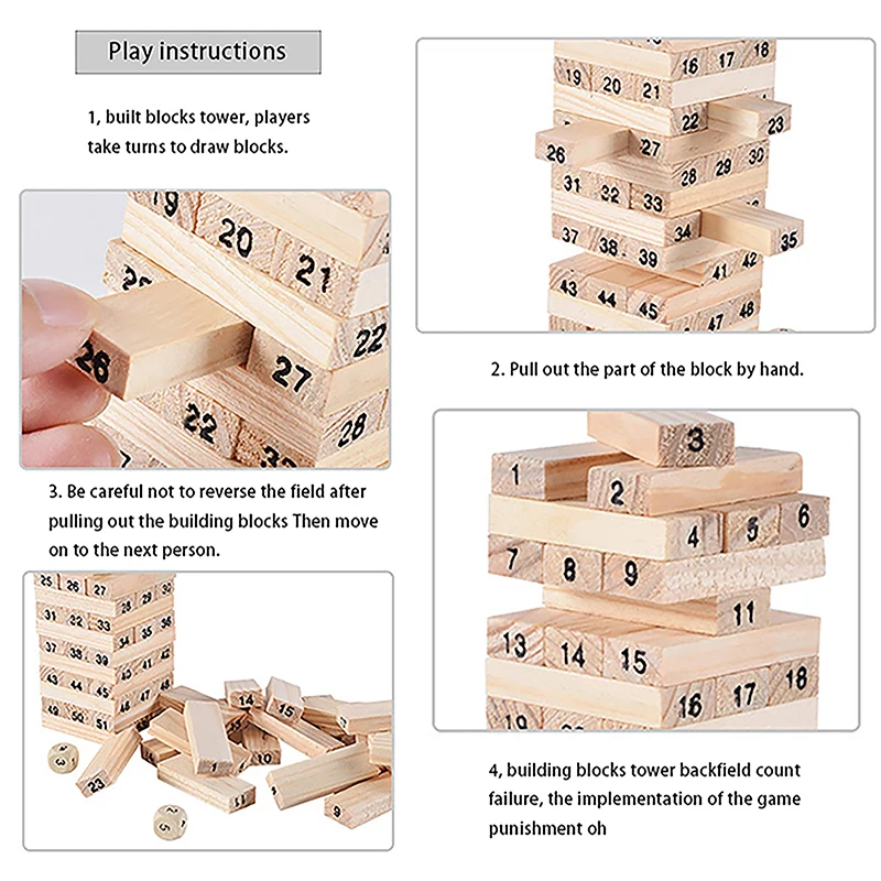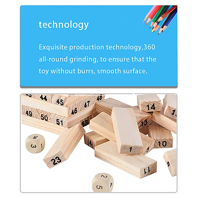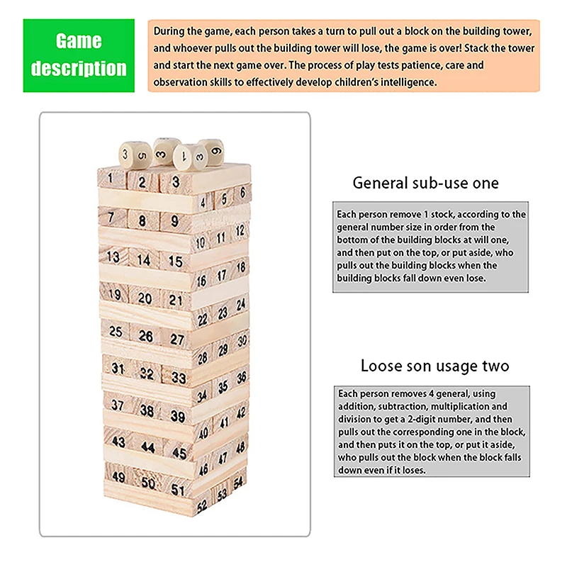 3. Diversified gaming methods: The product provides a variety of different gameplay modes, such as stacking height, stacking music, stacking tower draws, etc., which can meet the needs of children of different age groups.