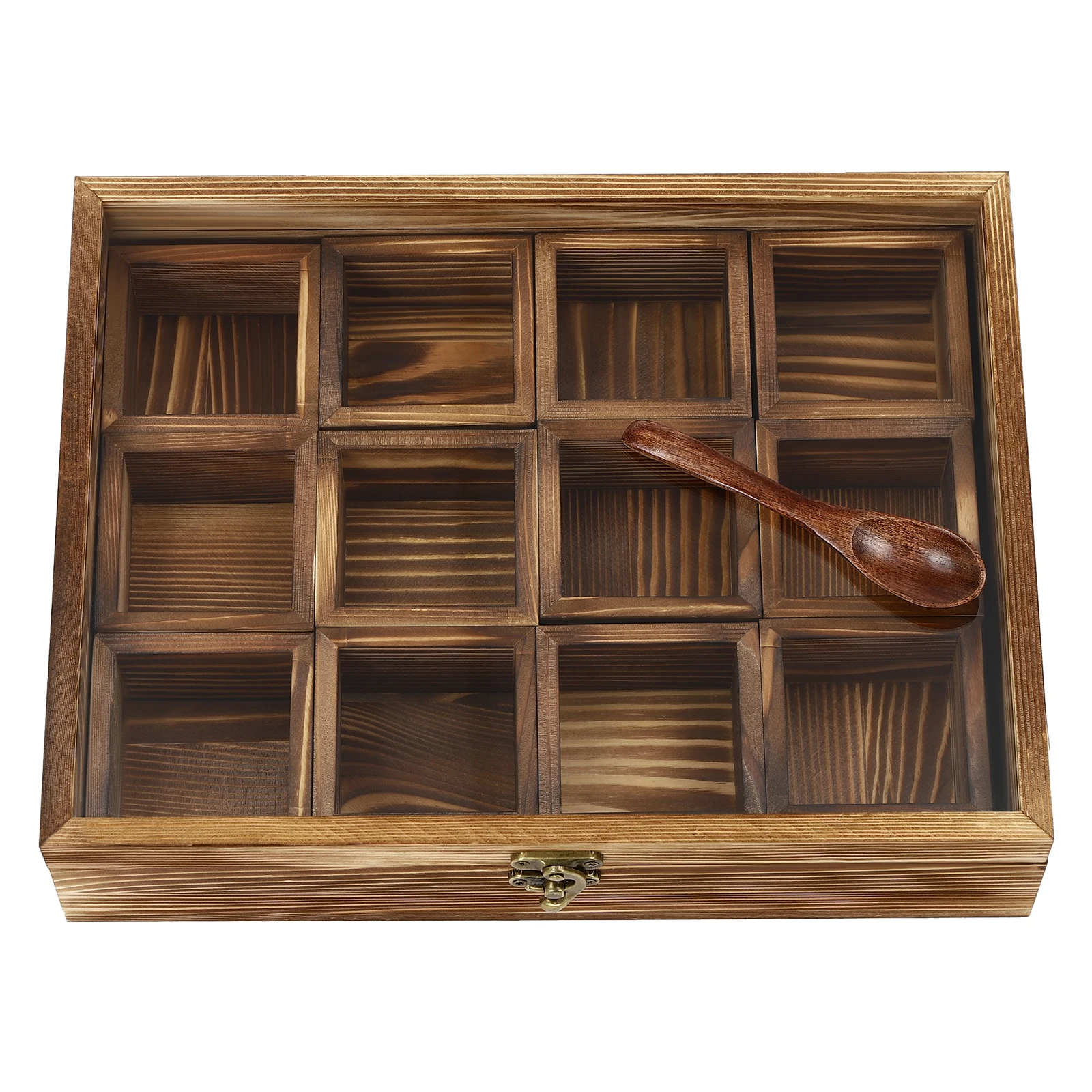 This 12-compartment wooden spice box is ideal for home and restaurant storage needs, keeping storage areas clean and tidy. It is made of high-quality pine wood, glass and hardware through the pine carbonation process, which is non-toxic and odorless, and is lightweight overall. The large capacity of 12 compartments allows you to store different kinds of spices. The matching spoon makes it easy to pick spices or teas. It is ideal for storing spoons of spices and teas, come and bring it home!