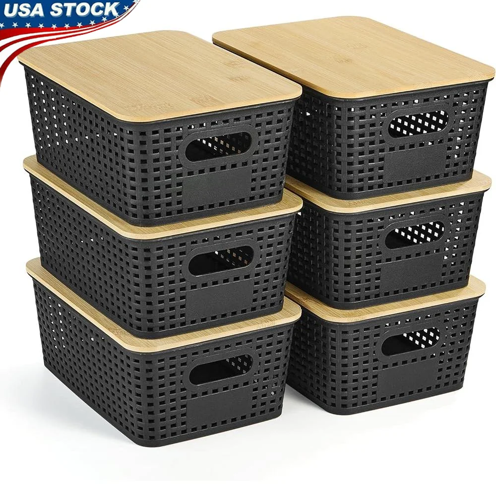 About this item    [PREMIUM MATERIALS & PERFECT SIZE] These storage containers are made of PP plastic and natural bamboo, BPA FREE, enduring & tough.  Perfect size for storage:10. 2L x 7. 2W x 4. 1H inch.  This plastic storage bins can helps you organize and store various items for your storage needs    [STYLE MEETS PRACTICALITY] This pantry organization and storage baskets with stylish woven design and natural bamboo lid, it’ll blend in with any decor and is perfect for home decor.  These storage bins with lids can help you organize scattered items, like kitchen storage, toy organizers, Bath accessories, books and stationery organizers, cabinet or closet storage    [STACKABLE & PORTABLE HANDLE] This plastic storage containers with lid with stacking design not only convenient storage, but also saves space and keeps things tidy.  Portable Handle on side of the baskets for easy removal from shelves, convenient and safe    [MULTI-PURPOSE STORAGE] These lidded organizing baskets are excellent for storage and practicality, great for storing a wide variety of household items.  These storage organizer can use in closets, cabinets, shelves, classroom, living rooms, bedrooms, bathrooms, offices and garages etc    [IDEAL STORAGE SOLUTION & SERVICE] Our storage baskets with lids are committed to solving the problem of household clutter storage, giving you a safe and neat environment.  ›