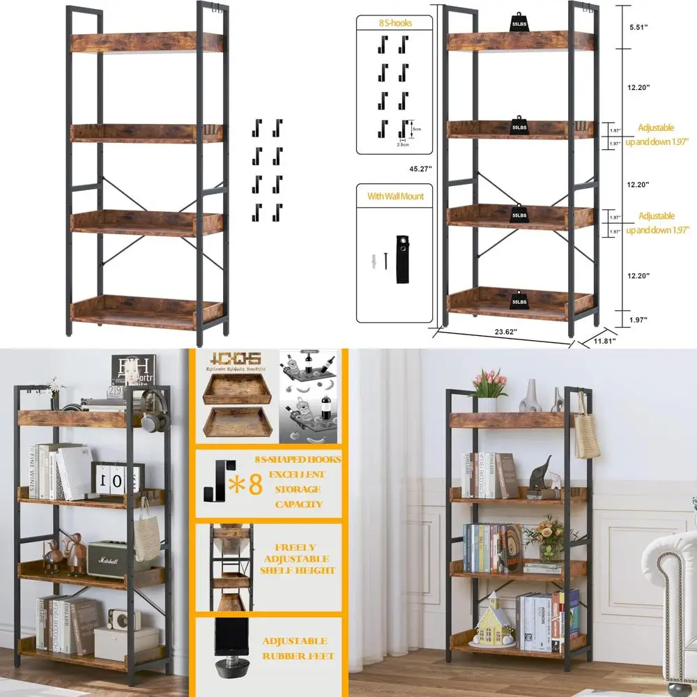 This industrial-style bookshelf features adjustable middle shelves, allowing you to tailor the space to fit your specific storage needs. It comes with edge protection to prevent accidental tipping, making it ideal for storing delicate items such as glass jars and seasonings. The 5-tier bookshelf boasts unique iron frame designs on each side, offering versatile storage solutions for items of varying heights, from books to decorative pieces. It also includes 8 multipurpose hooks for hanging items like headphones, toys, and small decorations. Assembly is straightforward with clear instructions and numbered parts, and the open design of the bookcase makes it easy to clean with a damp cloth. The bookshelf is equipped with 4 adjustable foot pads to ensure stability on uneven floors and to prevent damage to the surface. Made from high-quality metal and MDF, this tall bookshelf adheres to the US CARB P2 standard, ensuring it is durable, eco-friendly, and free from unpleasant odors.