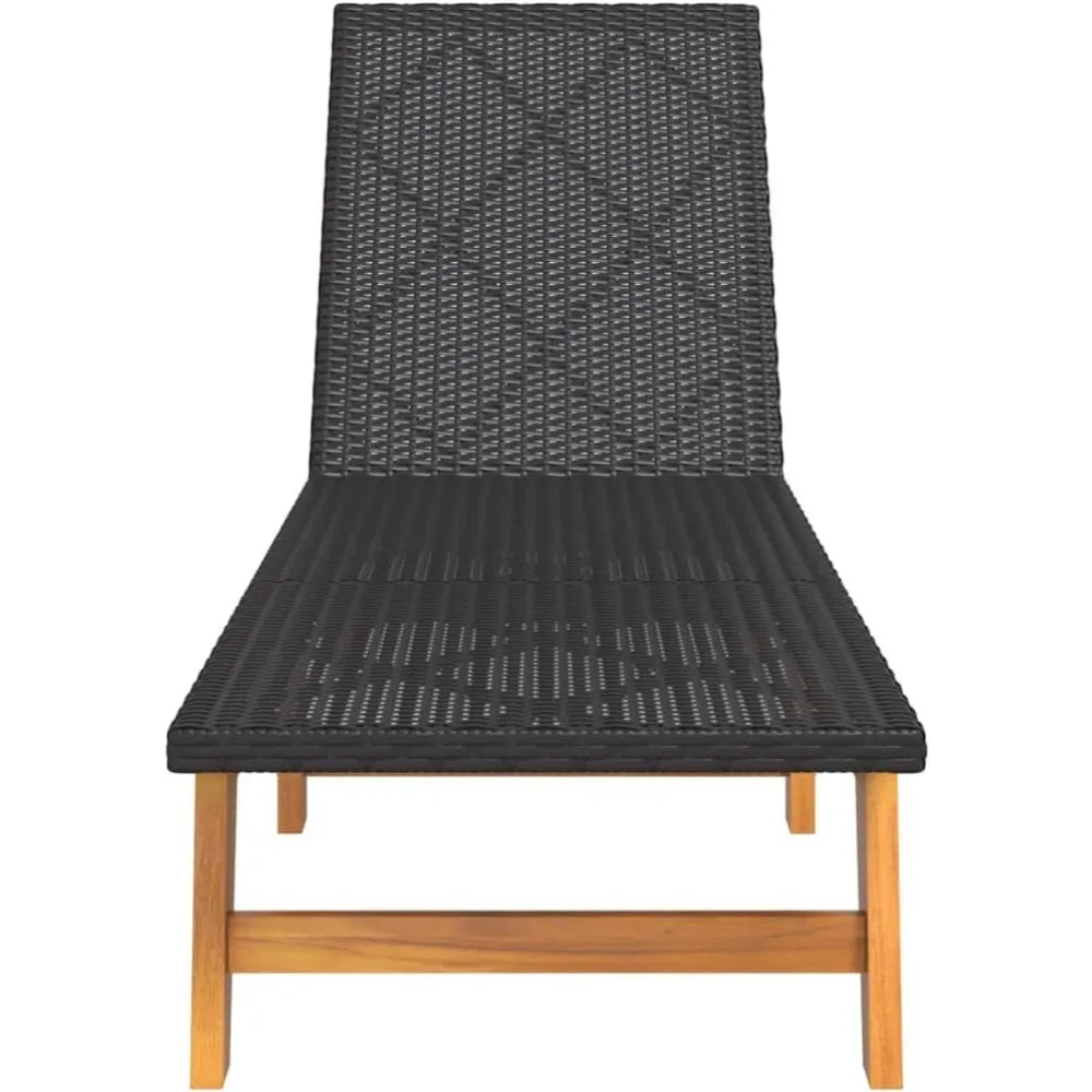 - Sun lounger:.Color: Black and Brown.Material: PE rattan, solid acacia wood with an oil finish, steel.Dimensions: 78.7" x 21.3" x 34.3" (L x W x H).Backrest with 4 adjustable positions.Table:.Material: Solid acacia wood with an oil finish.Dimensions: 15.7" x 15.7" x 15.7" (L x W x H).Delivery contains:.1 x Sun lounger.1 x Table.