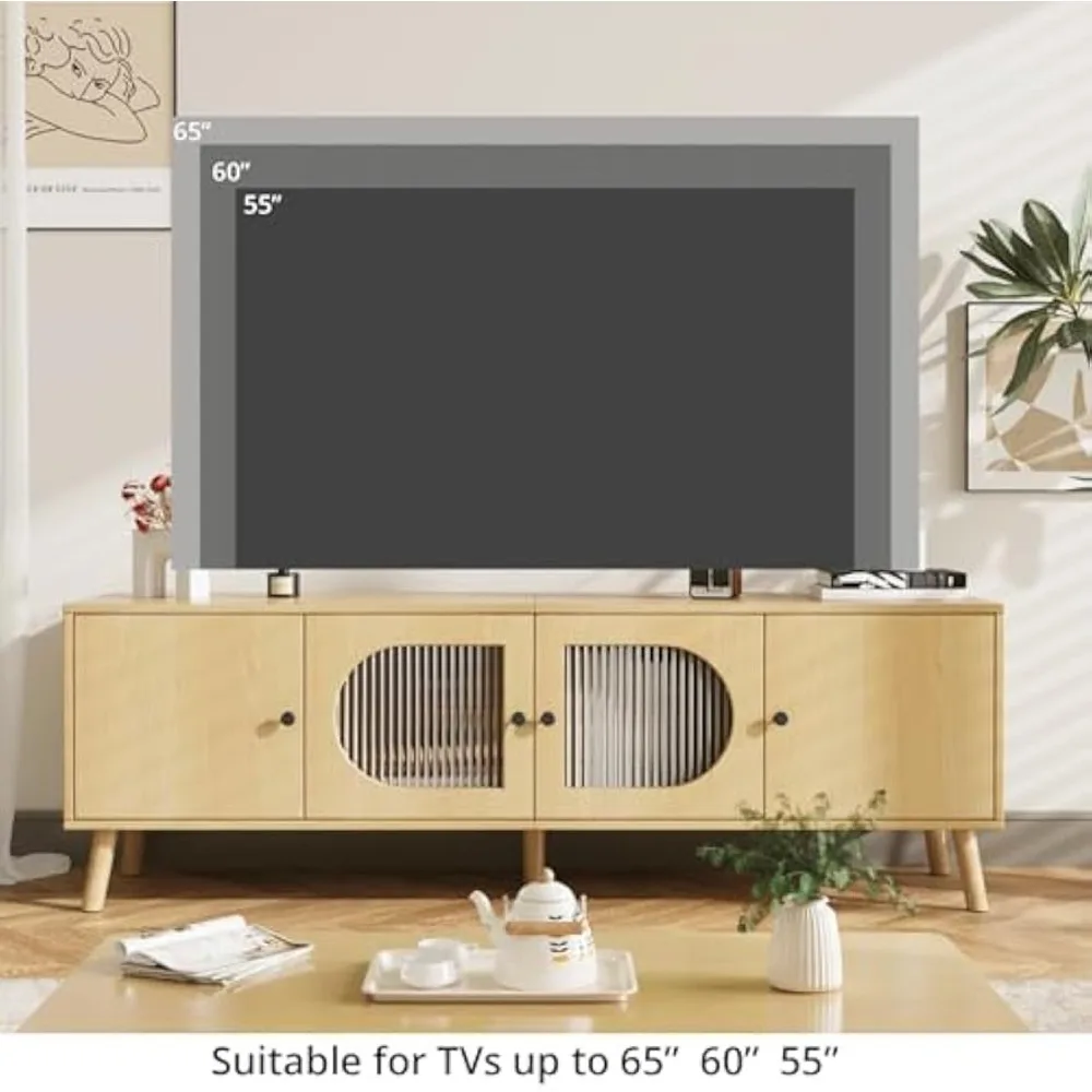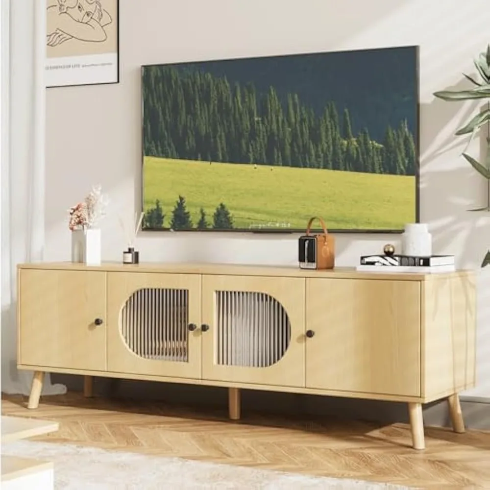 - 【Modern and Simple TV Cabinet】Adopting the classic Opposite-opening 4-door design with modern minimalist style and pine legs, the clean lines of the long TV cabinet design can be easily integrated into various decorative aesthetics to enhance the appearance of any room.