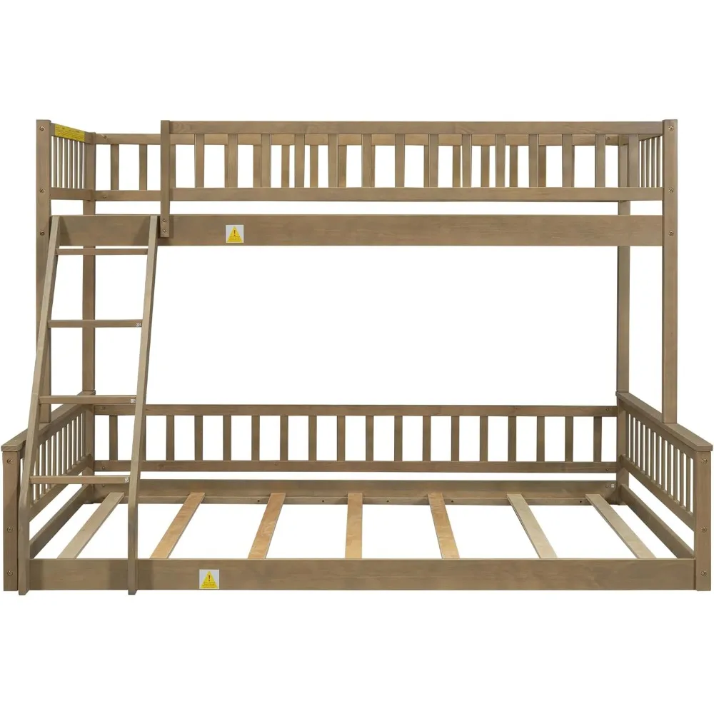 This bunk bed is crafted from high-quality solid pine wood and MDF, offering a sturdy structure that can support up to 400 pounds. The wooden slats provide secure support for the mattress, ensuring it doesn't slide, and there's no need for a box spring. Designed with safety in mind, the bunk bed features a 58-inch height and no underbed clearance, making it ideal for children. The 15.1-inch high guardrail on the top bunk adds an extra layer of security. The bunk bed's solid wood slats are integrated into a durable frame, offering additional floor support for enhanced stability. The bunk bed offers a versatile design, allowing you to configure it as a stacked bunk bed or as two separate platform beds, depending on your space and needs. With dimensions of 84.7 inches long, 63.7 inches wide, and 58.3 inches high, this compact bunk bed is perfect for small spaces. It's recommended to use a standard double mattress that is no more than 8 inches thick. Assembly is straightforward, with all necessary accessories and instructions provided for an easy installation process. When it's time to move, disassembling the bed is also a simple task. This bunk bed combines exceptional quality and affordability, ensuring years of enjoyment.
