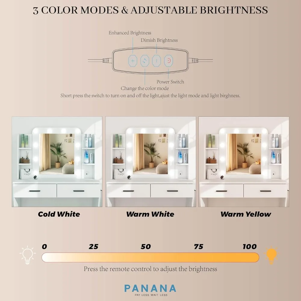 - Hollywood-Style Mirror with Adjustable Lighting: The vanity is equipped with a large mirror framed by 10 Hollywood-style bulbs that offer three lighting modes: warm white, natural light, and cool white. Each light mode’s brightness is adjustable, allowing you to create the perfect ambiance for makeup application, skincare routines, or simply getting ready for the day.