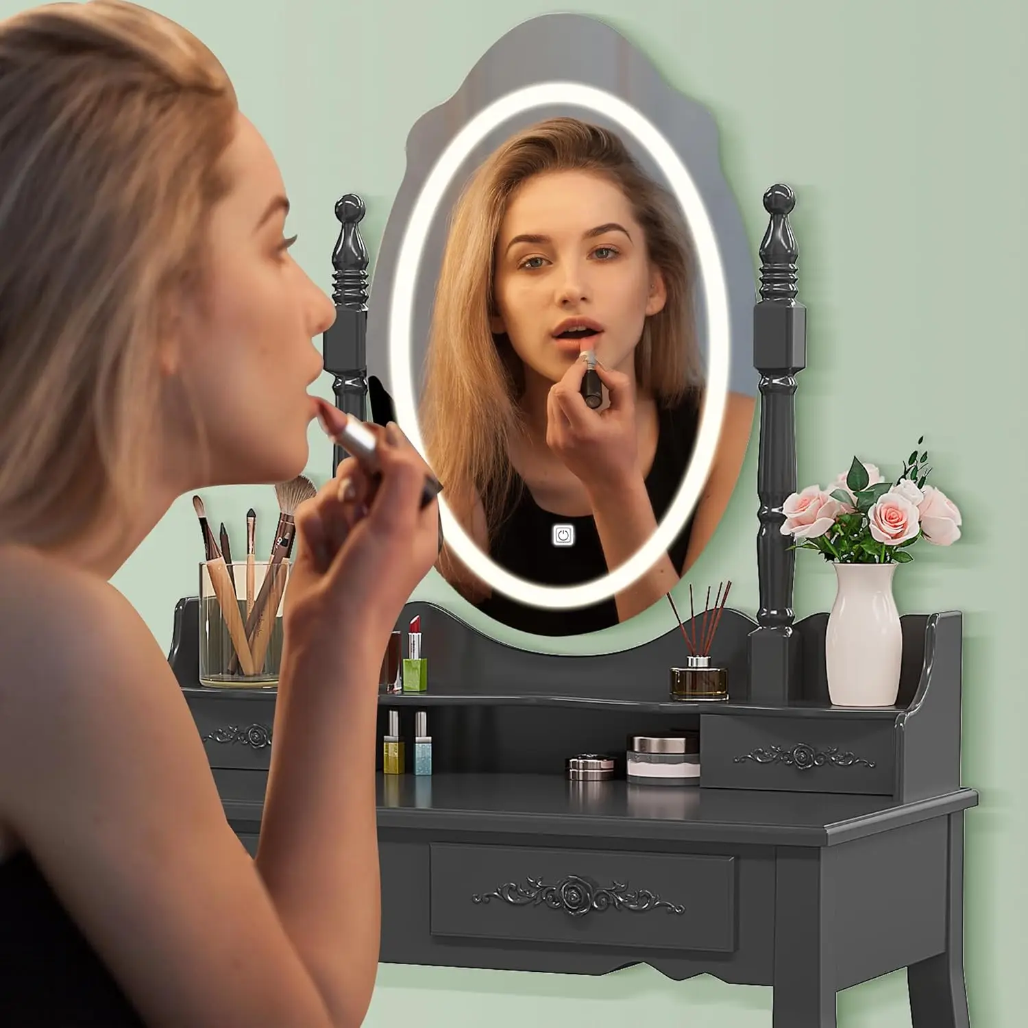 • 【Makeup Desk with LED Light Mirror】Exquisite vanity table mirror with built-in safe and efficient LED light strips, bringing you a whole new makeup experience. 3 Light colors for you to choose from: warm yellow, warm white and cool white. You can easily adjust the brightness according to different scenes and makeup needs, ensuring your makeup looks its best in any environment. Light touch on the switch to toggle colors, long press on the switch to adjust brightness.
