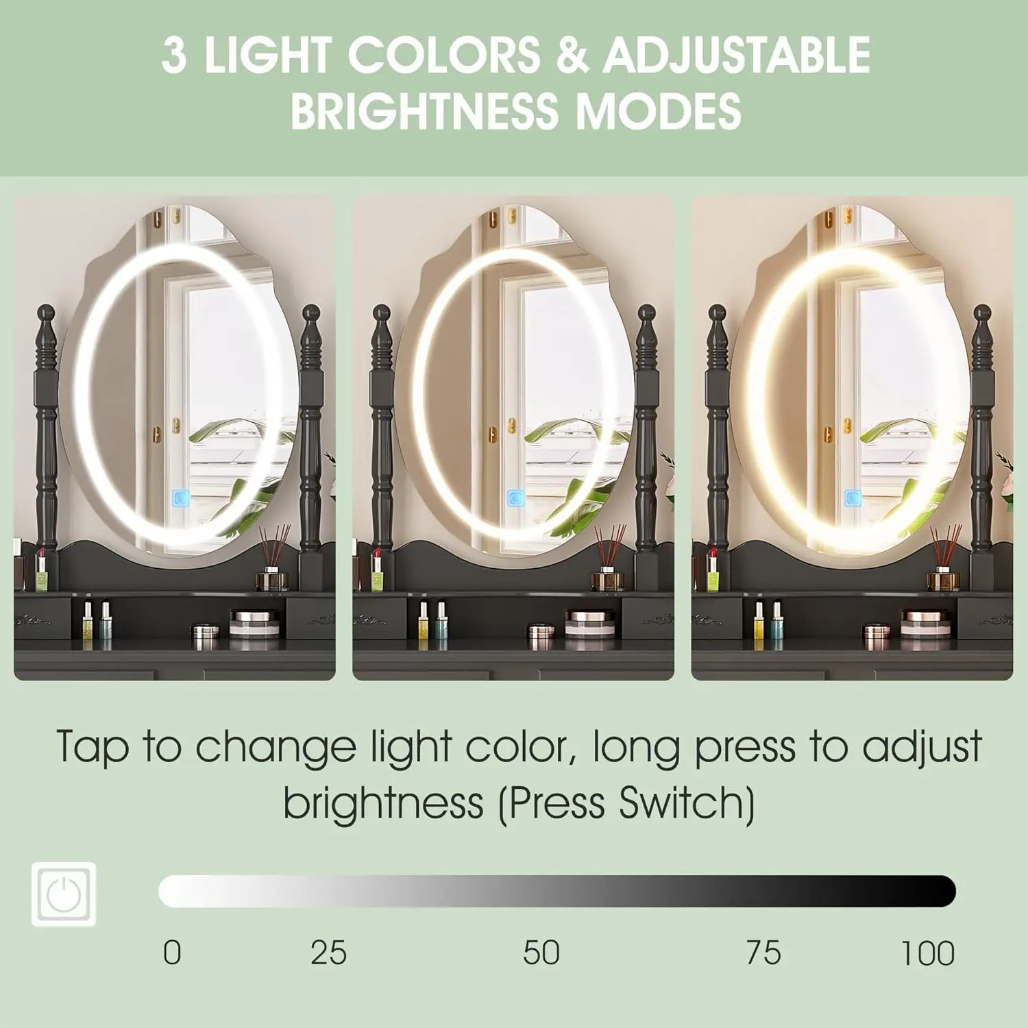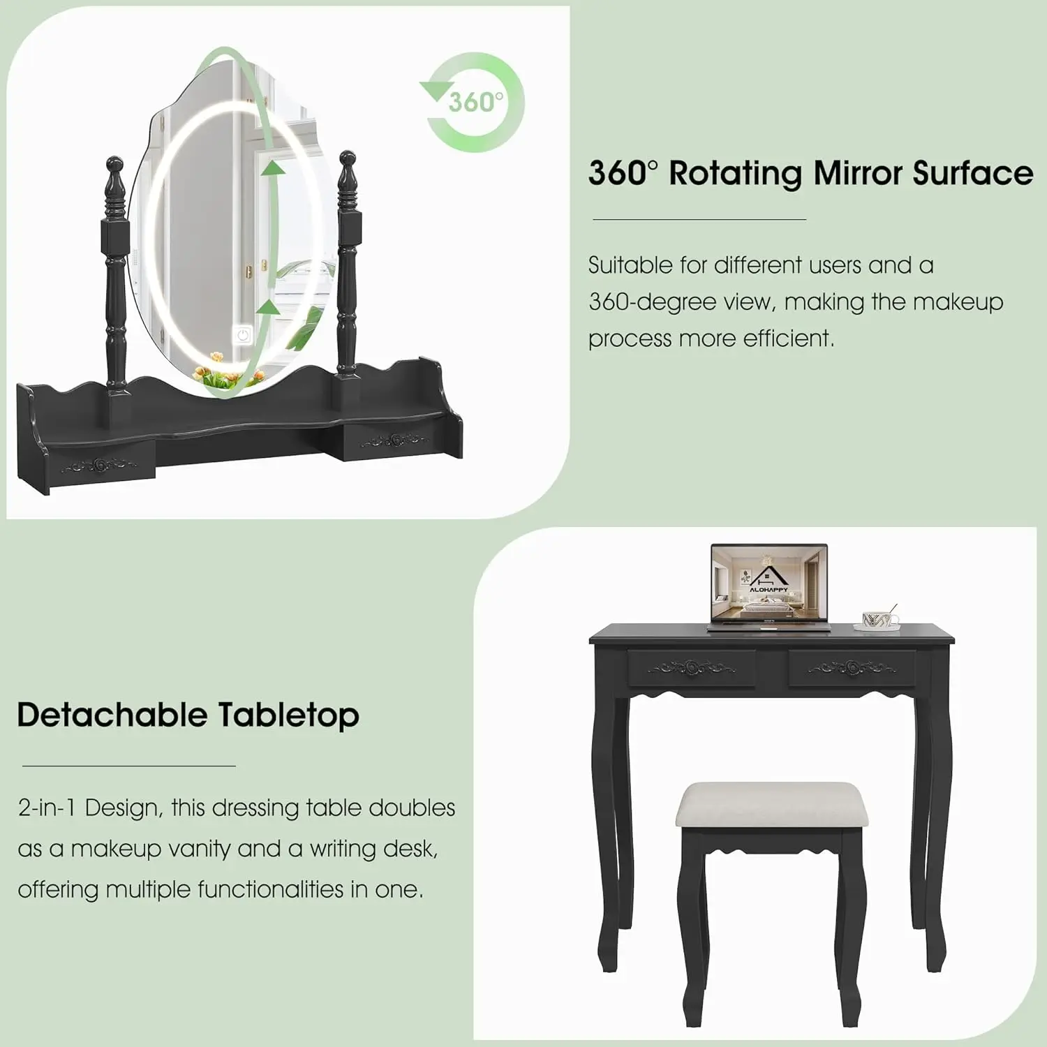 Vanity Desk with Mirror and Lights, Modern Vanity Makeup Table and Cushioned Stool Set with 4 Drawers, 3 Color Lighting Modes with Adjustable Brightness, Dressing Table Set for Bedroom (Black)